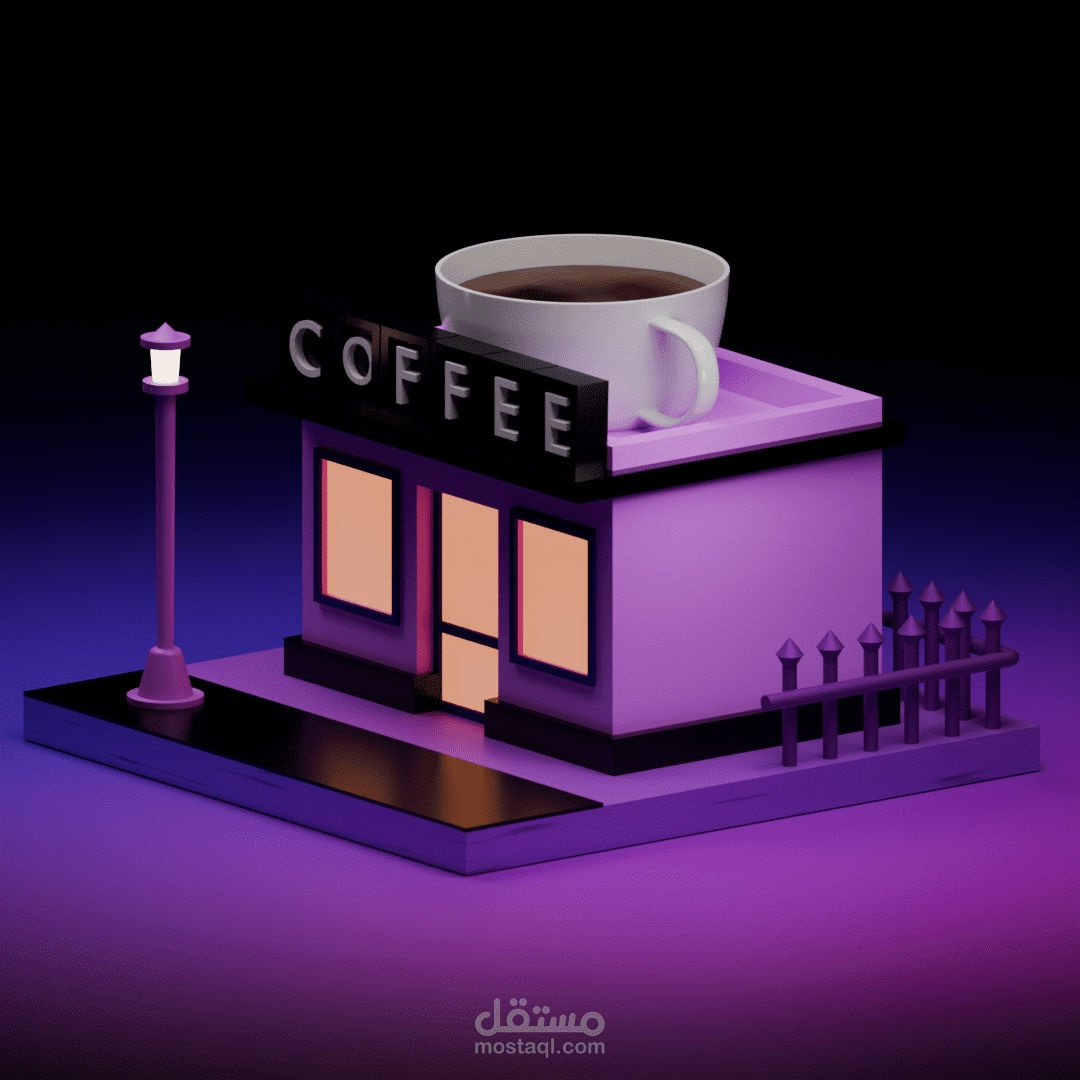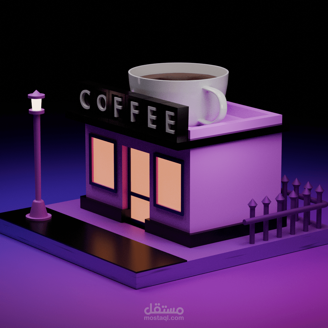 يتضمن العمل تصميم مبنى مقهى مع عناصر محيطة مثل لافتة المقهى، فنجان القهوة، الإضاءة الخارجية والسياج، مع الحفاظ على تكوين بصري متوازن يبرز الفكرة الرئيسية للتصميم. تم استخدام ألوان متناسقة وإضاءة ناعمة لإعطاء إحساس عصري وجذاب مناسب للإعلانات أو المحتوى البصري على المنصات الرقمية.