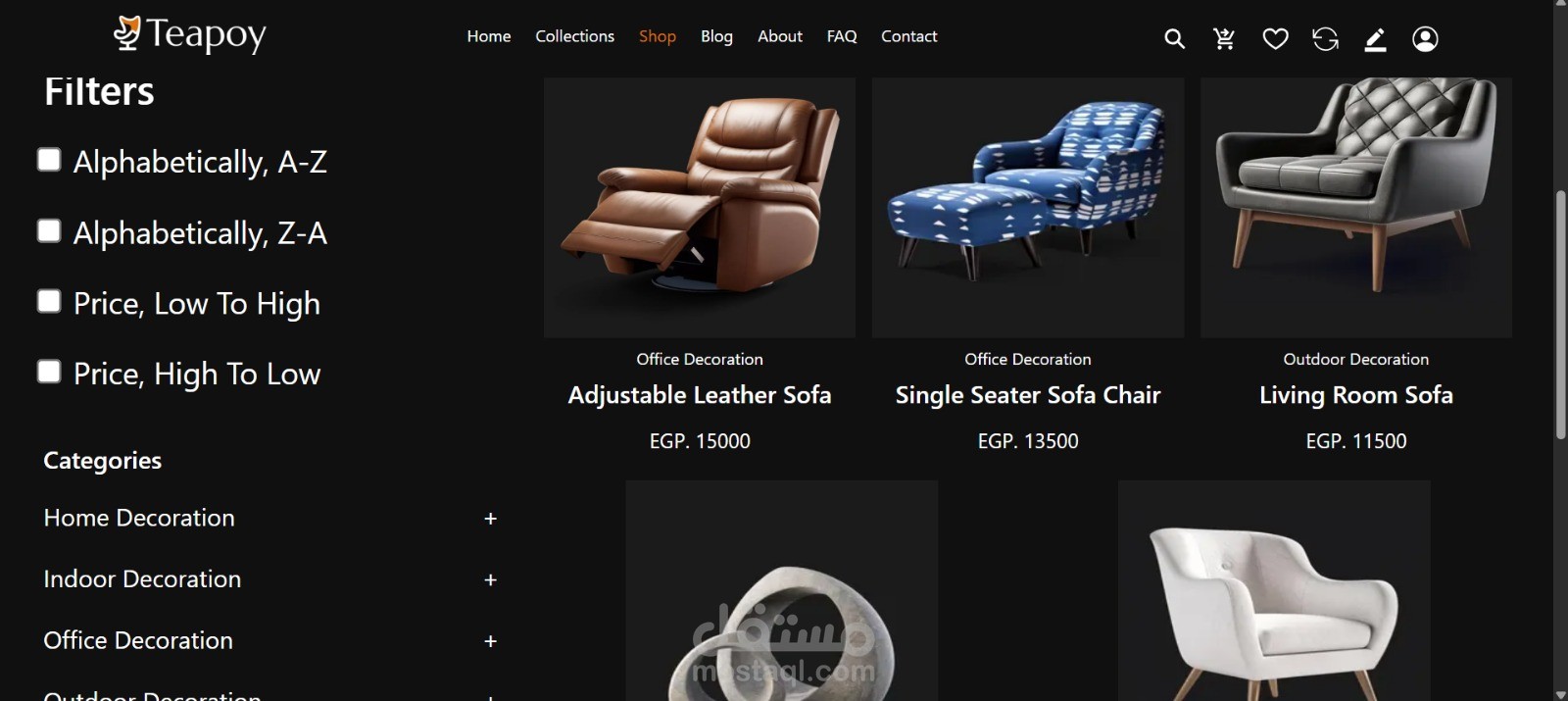 الموقع يهدف إلى مساعدة العملاء على تصفح منتجات الديكور بسهولة مع تجربة مستخدم سلسة وتصميم عصري يناسب مواقع التجارة أو عرض المنتجات.