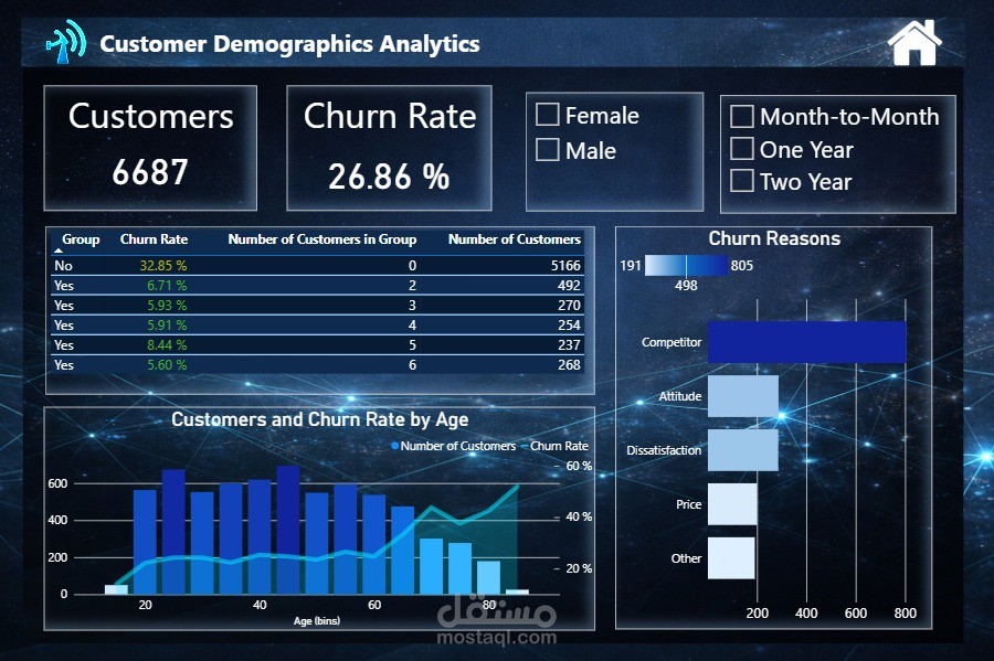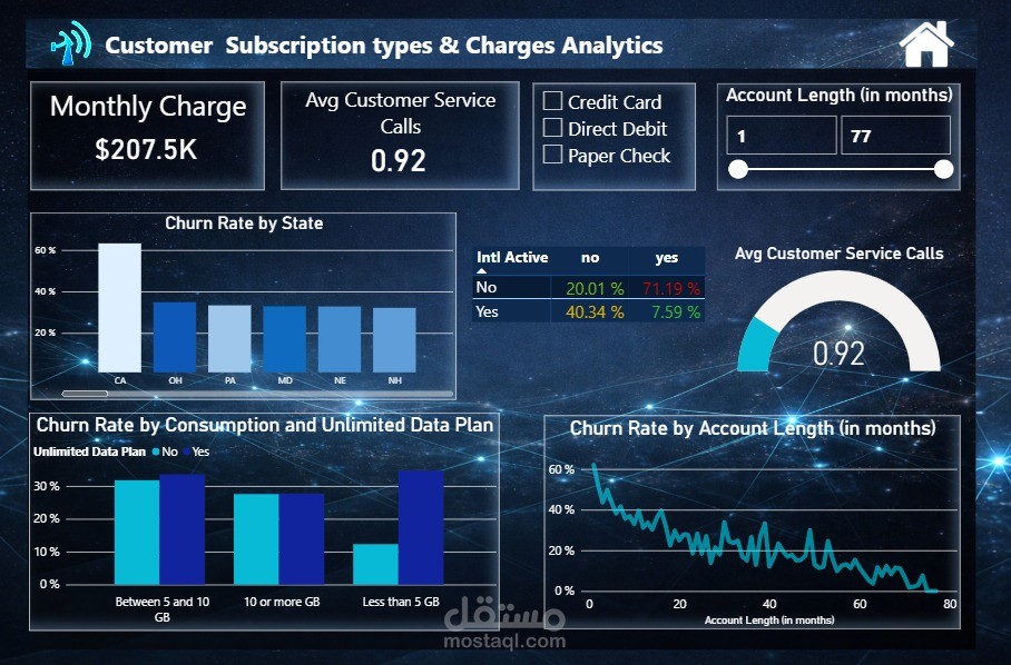 تتضمن اللوحة مؤشرات رئيسية مثل عدد العملاء، معدل التسرب، الإيرادات الشهرية، ومتوسط تواصل العملاء مع خدمة الدعم. كما توفر تحليلات تفصيلية حسب العمر، نوع الاشتراك، طرق الدفع، مدة الاشتراك، مستوى استهلاك البيانات، والتوزيع الجغرافي.