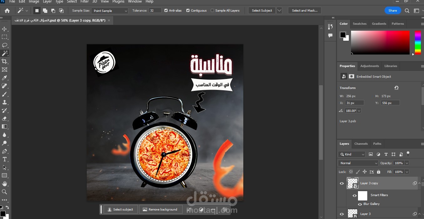 تصميم إعلان إبداعي لمطعم بيتزا يعتمد على فكرة بصرية مبتكرة تربط بين عنصر الوقت والمنتج، حيث تم دمج صورة البيتزا داخل ساعة منبه لإيصال رسالة "ملبّية في الوقت المناسب" بأسلوب جذاب وملفت.