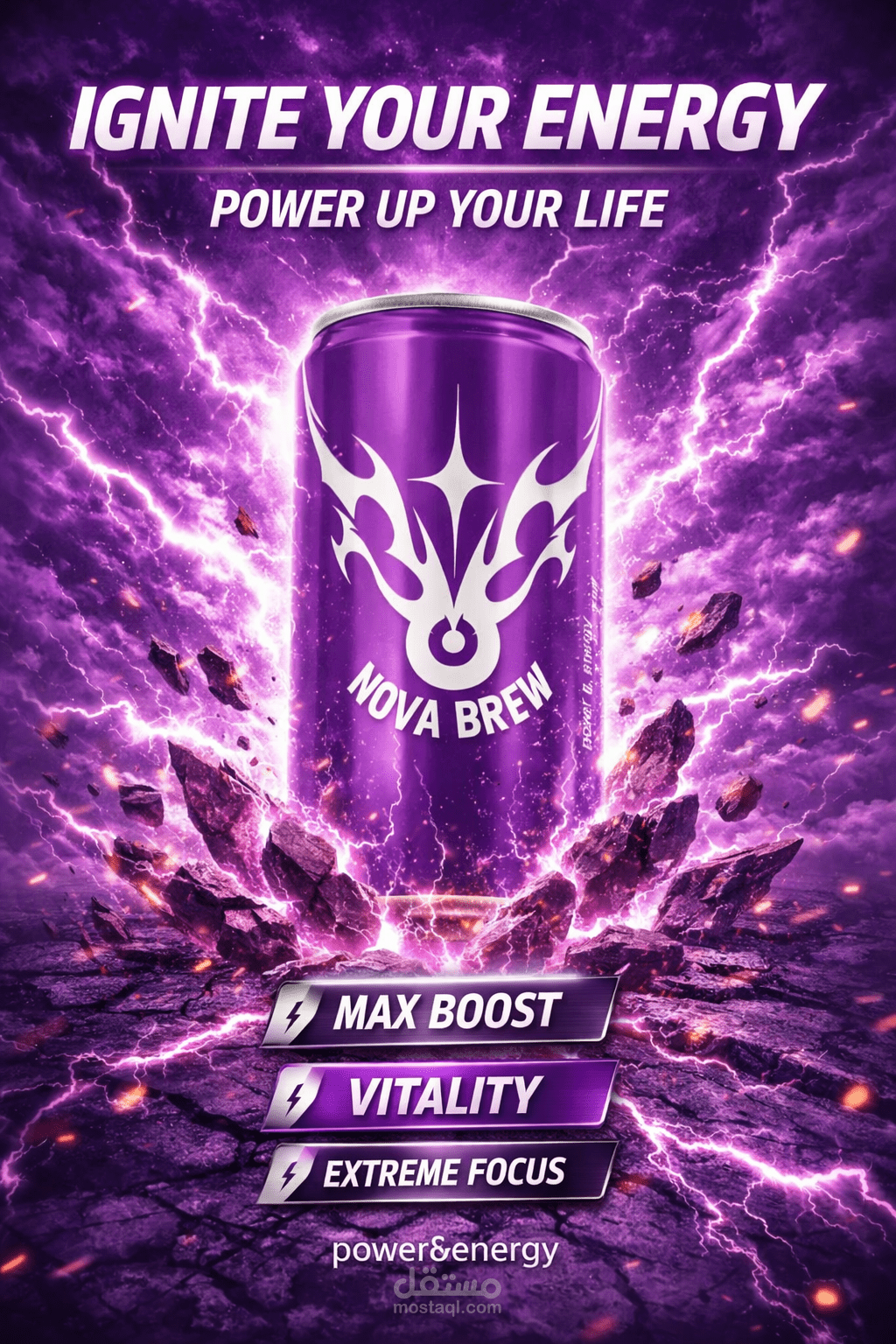 NOVA BREW is a conceptual branding project for a modern natural energy drink. The goal of this project was to create a bold and dynamic brand identity that reflects energy, focus, and a modern lifestyle. The design combines strong visual elements with a clean and minimal style to make the brand stand out on shelves and digital platforms