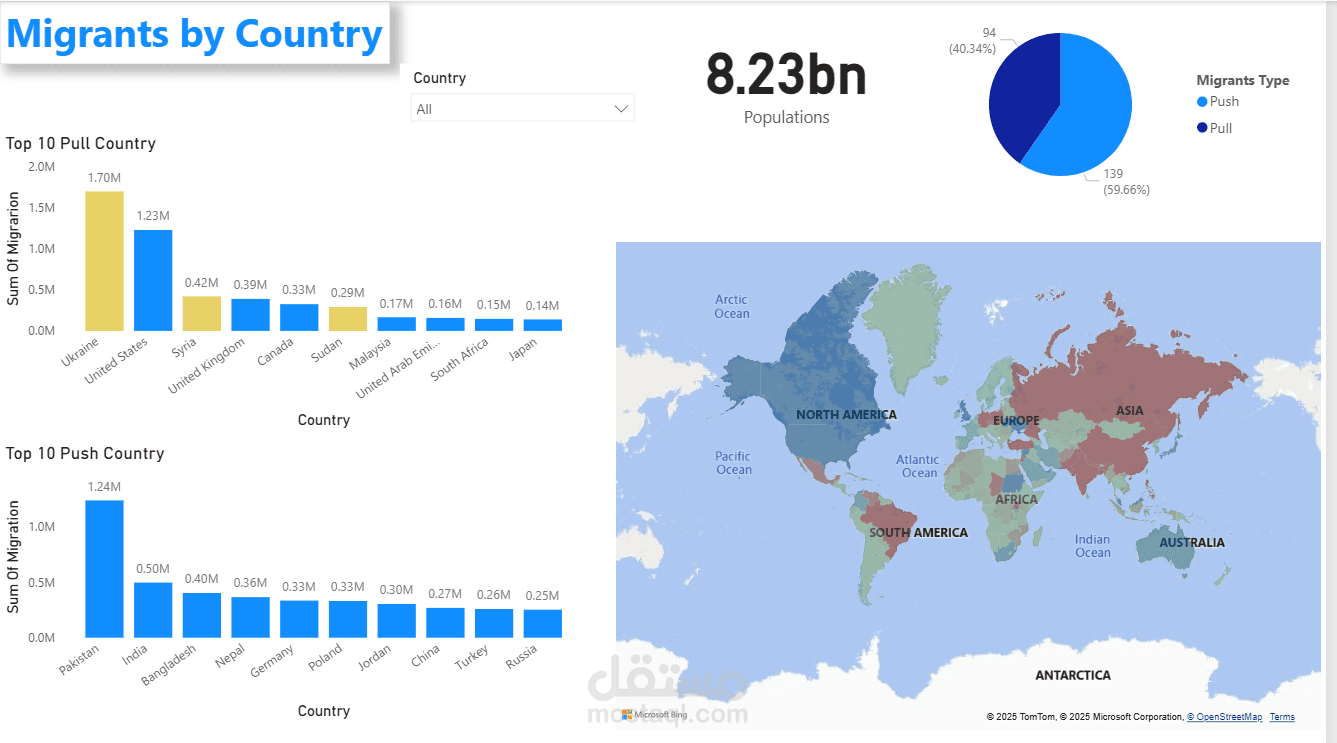 What Top 10 Country Push Migrants? -Filled map is used in data visualization to display how a single numeric variable (or measure) varies across defined geographical regions