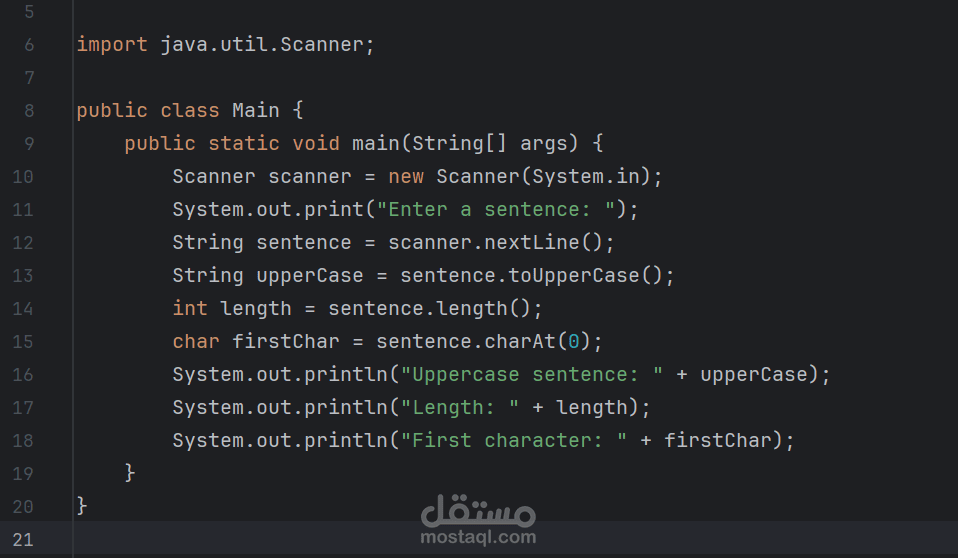 أولًا: البرنامج يطلب من المستخدم كتابة جملة باستخدام Scanner. هذه الأداة تسمح للبرنامج أن يسمع ما يكتبه المستخدم من الكيبورد.