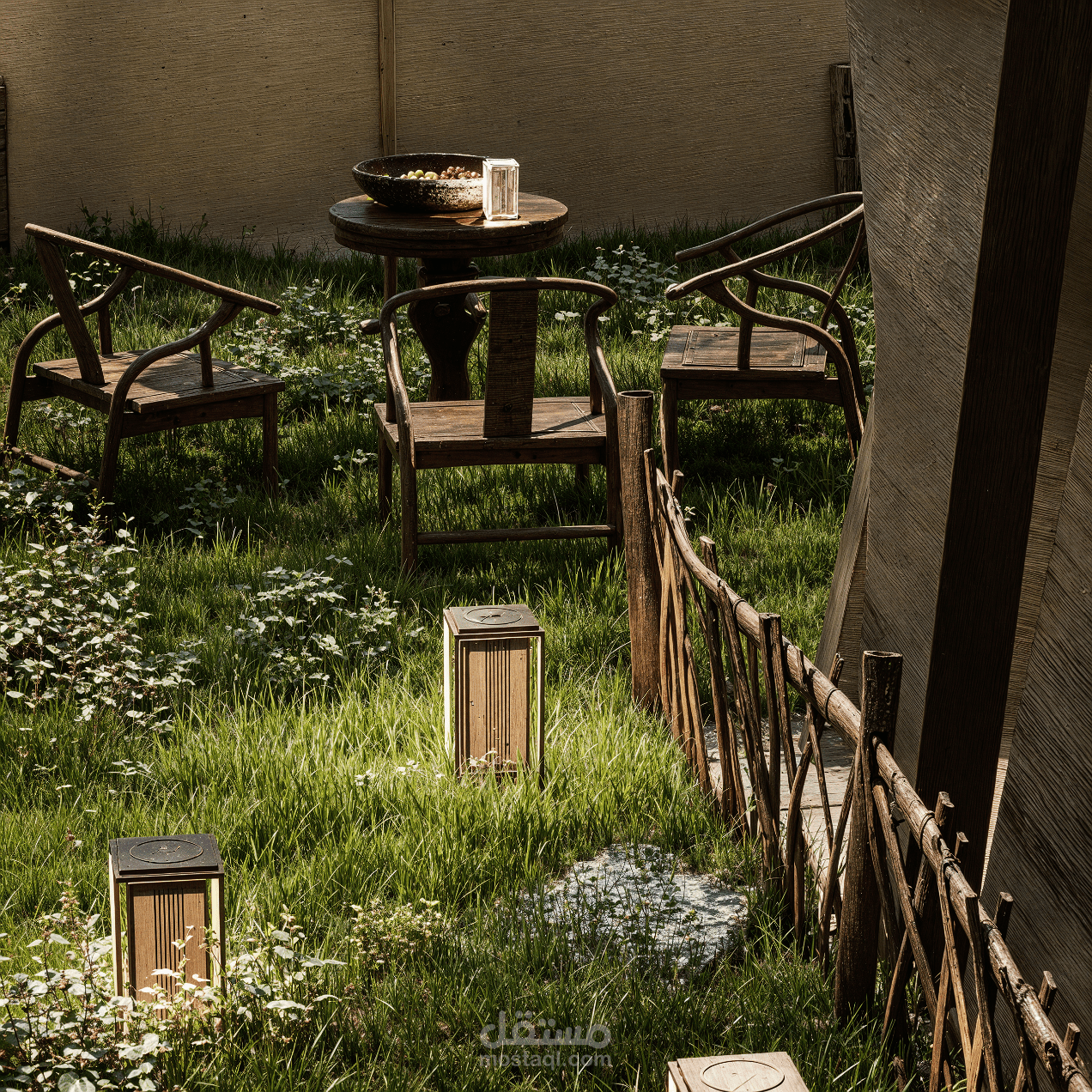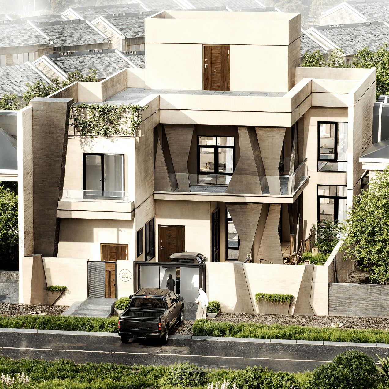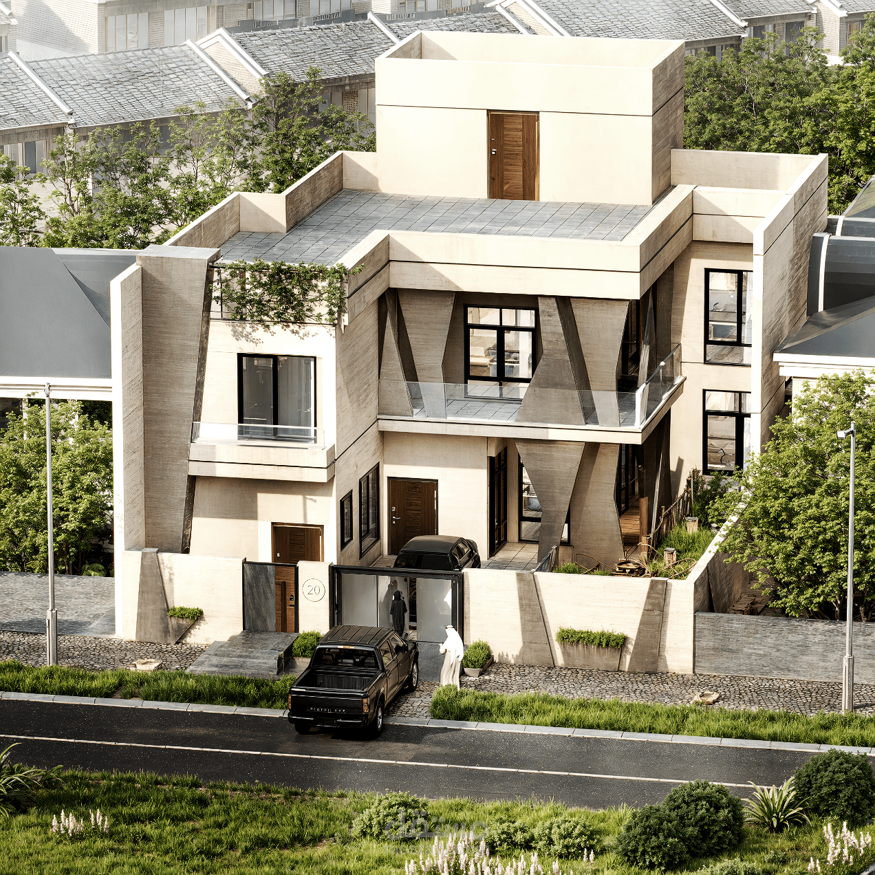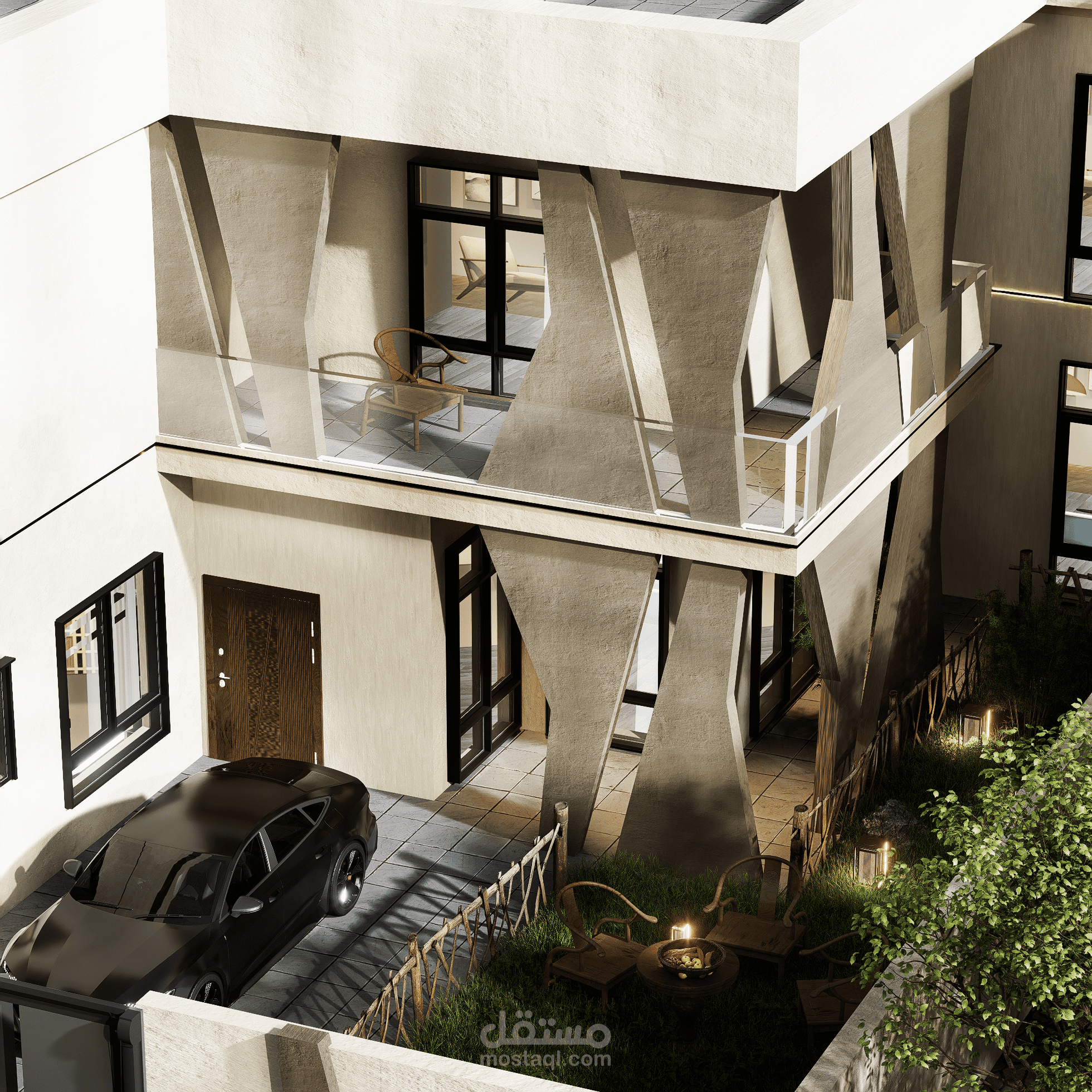 يجمع هذا المشروع بين قوة الكتل الخرسانية ونعومة التفاصيل الطبيعية، حيث تبرز الأعمدة النحتية المائلة كعنصر بصري مهيمن يكسر جمود الواجهات التقليدية.