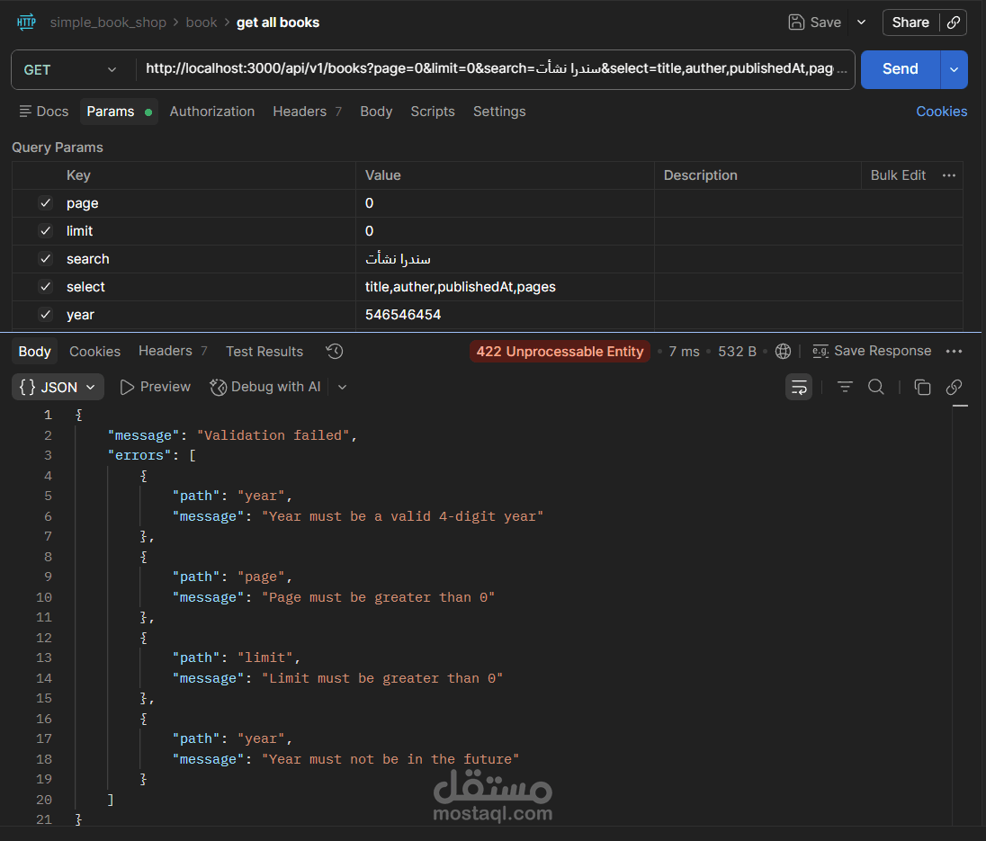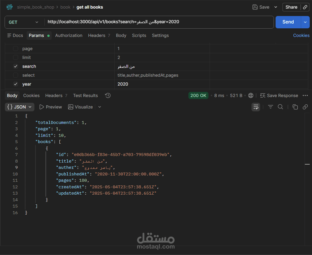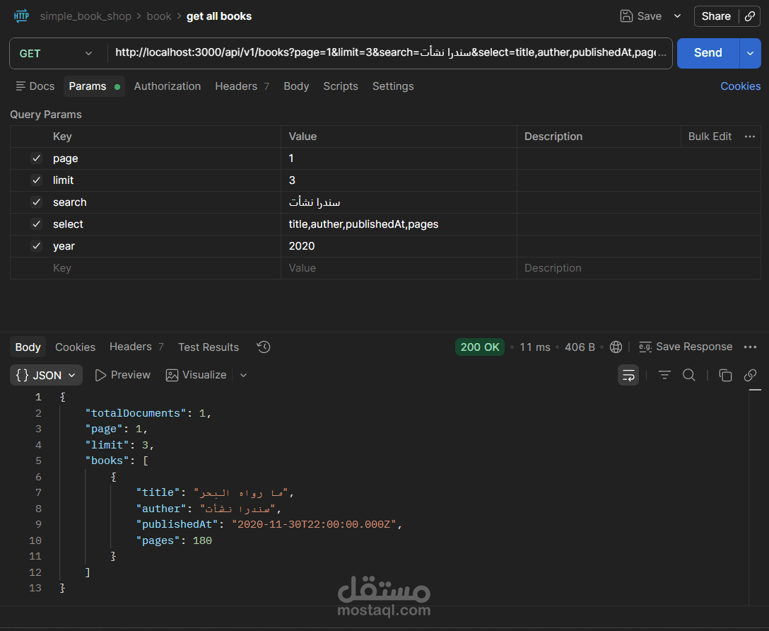 يتيح التطبيق إجراء جميع عمليات CRUD على الكتب (إضافة، عرض، تعديل، حذف)، مع دعم كامل للبحث النصي، والتصفية بالسنة، وتقسيم النتائج إلى صفحات (Pagination)، والتحكم في الحقول المُرجَعة في الاستجابة.