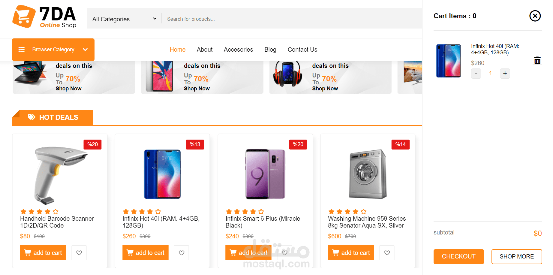 "واجهة متجر إلكتروني حديثة لعرض وبيع المنتجات عبر الإنترنت، تتضمن نظام تصفح للفئات، قسم العروض الخاصة (Hot Deals)، وإمكانية إضافة المنتجات إلى سلة التسوق مع عرض تفاصيل الطلب. يركز التصميم على تجربة مستخدم سهلة وتنظيم واضح للمنتجات مع إبراز الخصومات والعروض بطريقة جذابة."