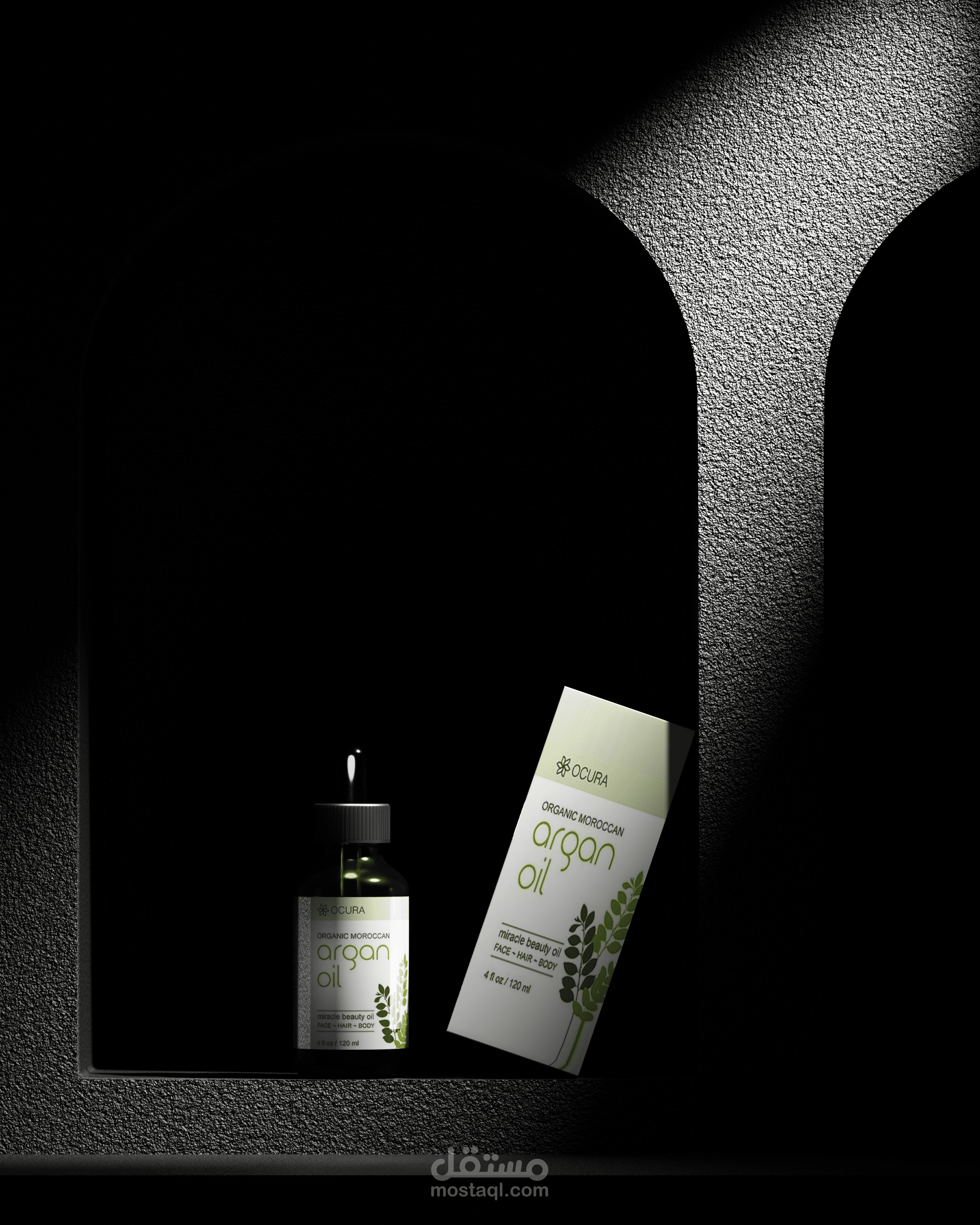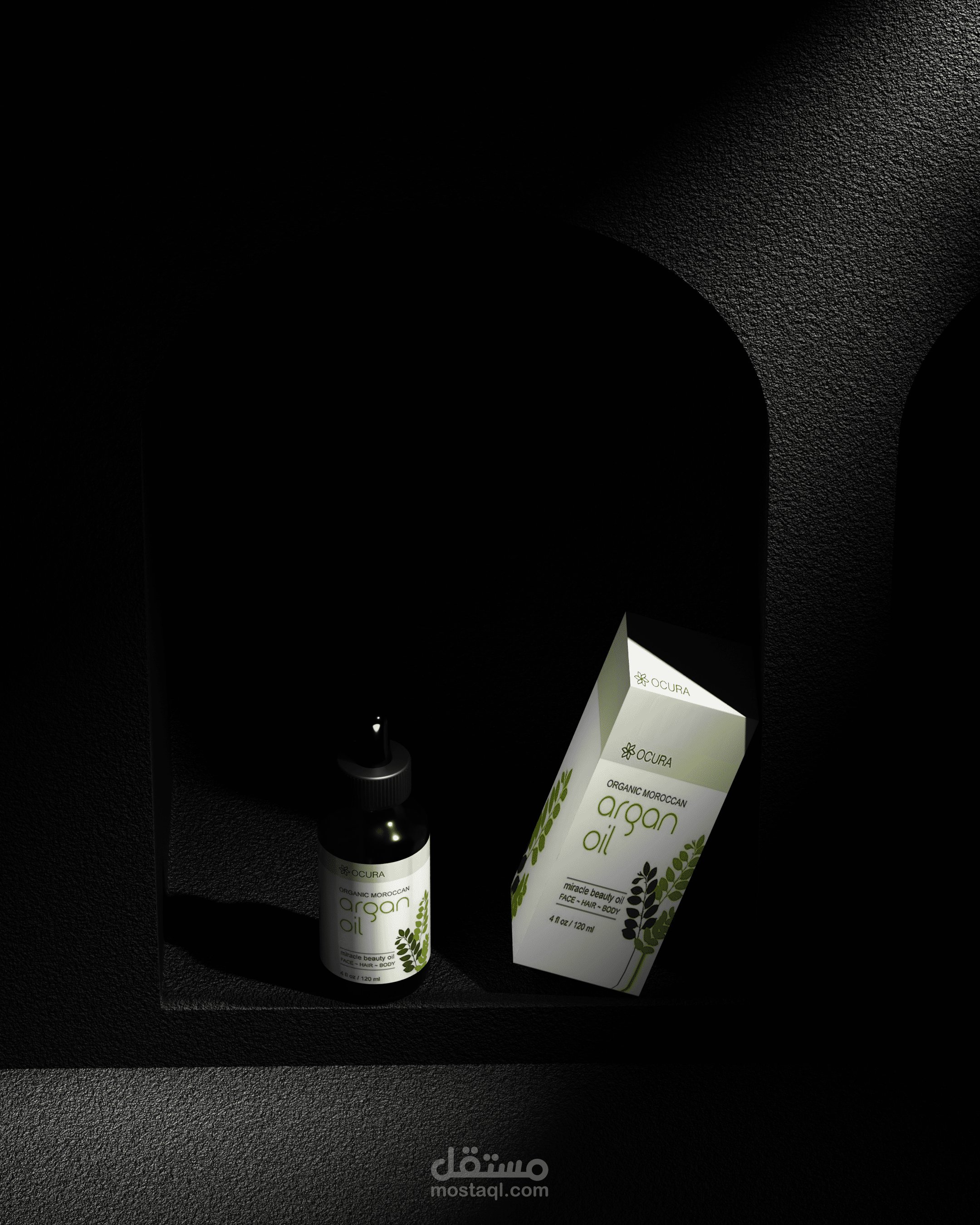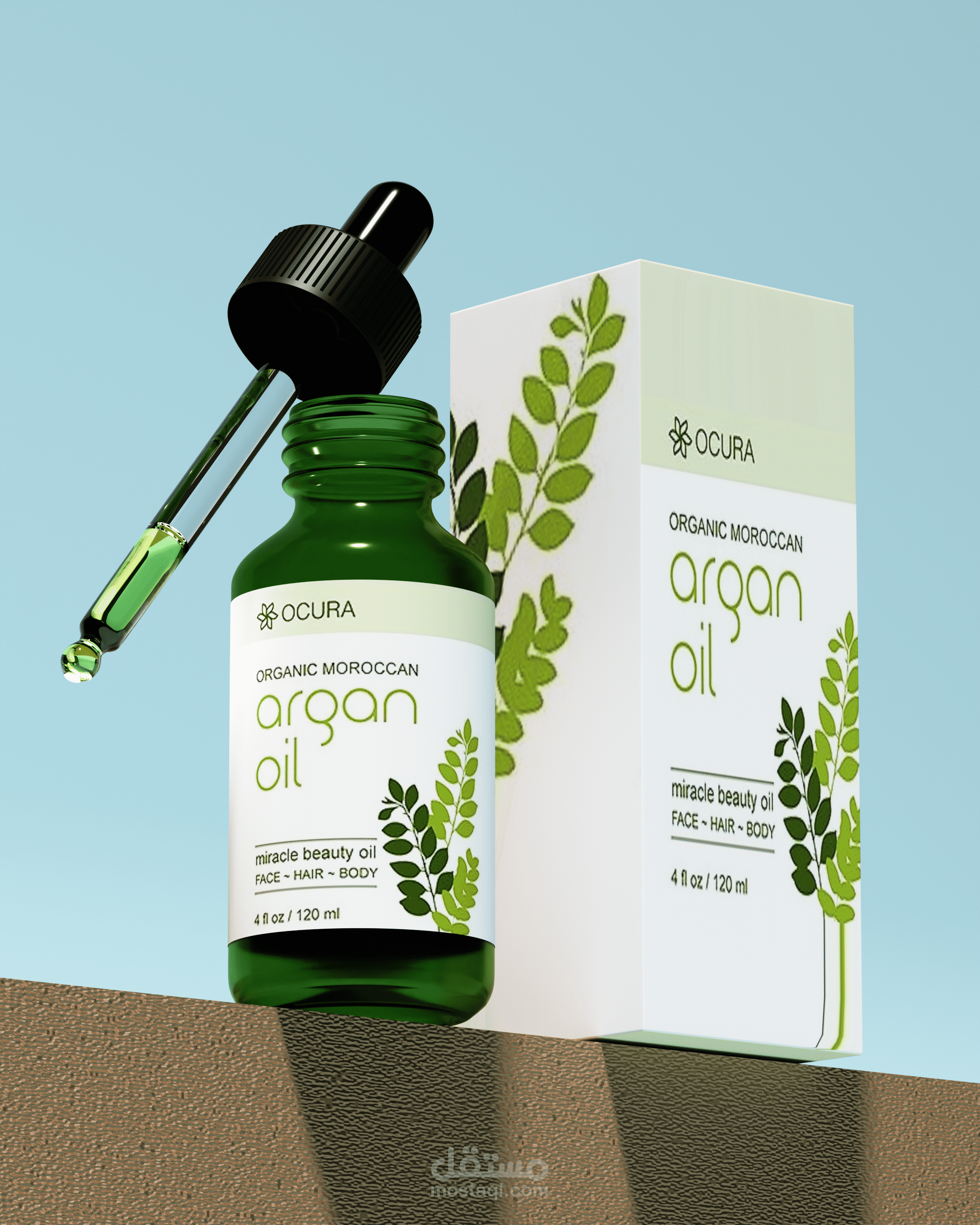 تصميم وعرض ثلاثي الأبعاد (3D Product Visualization) لمنتج زيت الأرجان، يركز على إبراز تفاصيل العبوة والهوية البصرية بطريقة واقعية وجذابة.