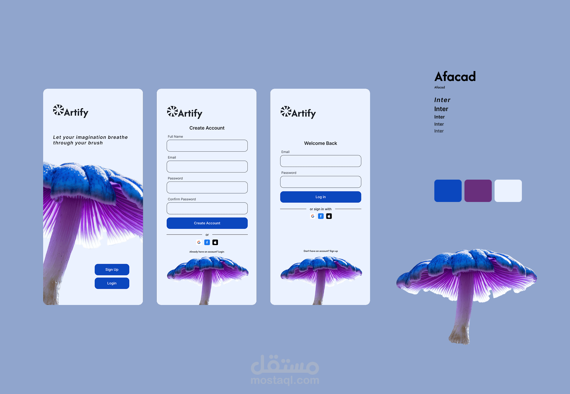 تصميم واجهات مستخدم حديثة لشاشات تسجيل الدخول وإنشاء حساب لتطبيق موبايل باسم Artify. يركز التصميم على البساطة وسهولة الاستخدام مع الحفاظ على مظهر بصري جذاب يعكس هوية التطبيق الإبداعية.