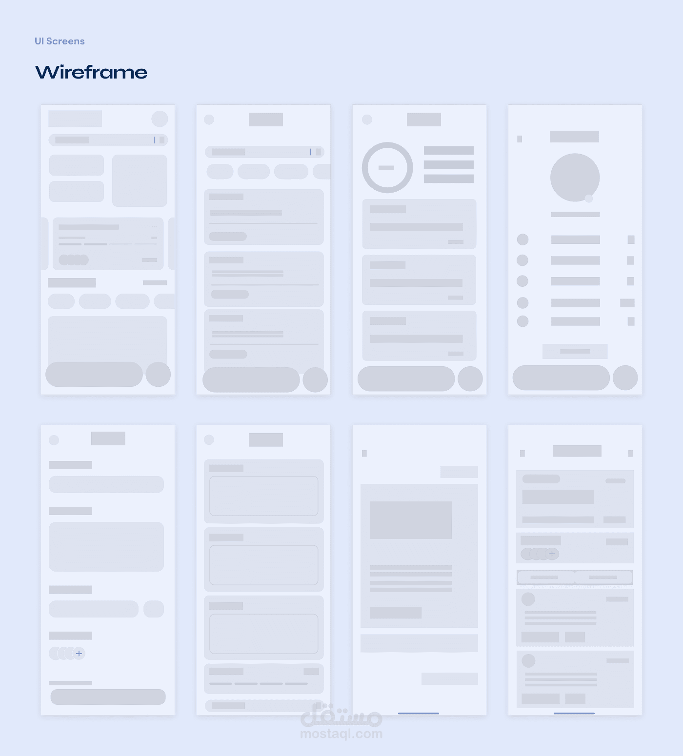 تصميم Wireframe لتطبيق موبايل يوضح الهيكل الأساسي للواجهة وتجربة المستخدم قبل مرحلة التصميم النهائي.