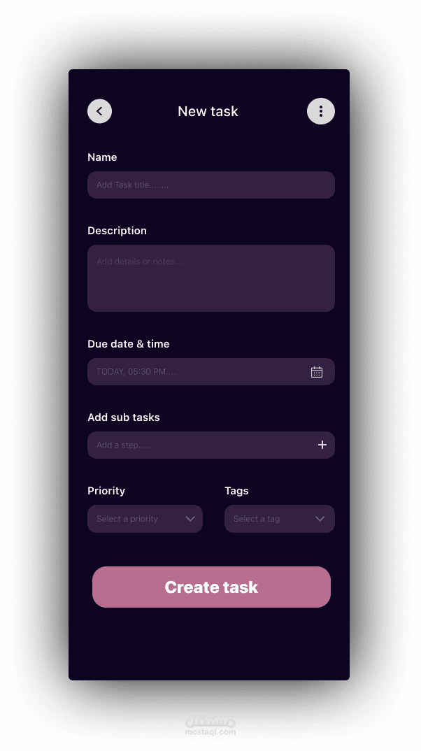 إدارة المهام (Task Management): * شاشة مخصصة لإضافة مهام جديدة بسهولة.