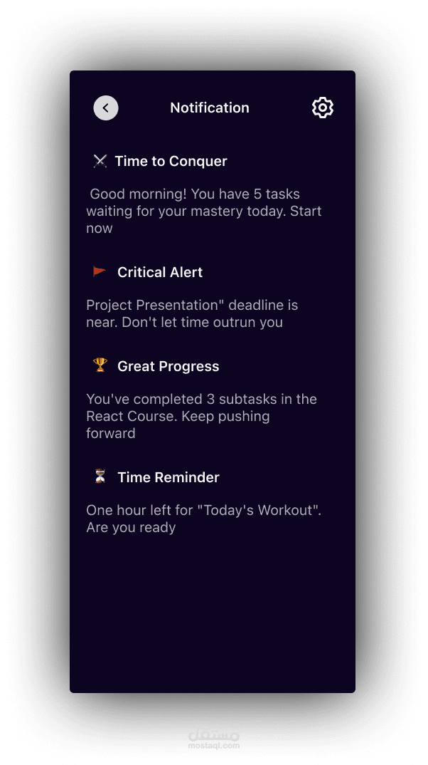 نظام الإشعارات الذكي (Smart Notifications): تصميم مبتكر لمركز التنبيهات يشمل رسائل تحفيزية، تنبيهات حرجة للمواعيد النهائية، وتذكيرات دورية.