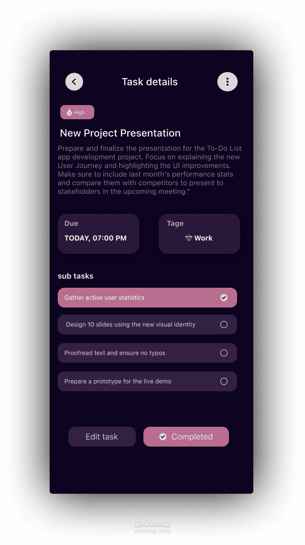 شاشة تفاصيل المهمة (Task Details) تتضمن قوائم مرجعية للمهام الفرعية (Sub-tasks) مع مؤشرات بصرية لنسبة الإنجاز.