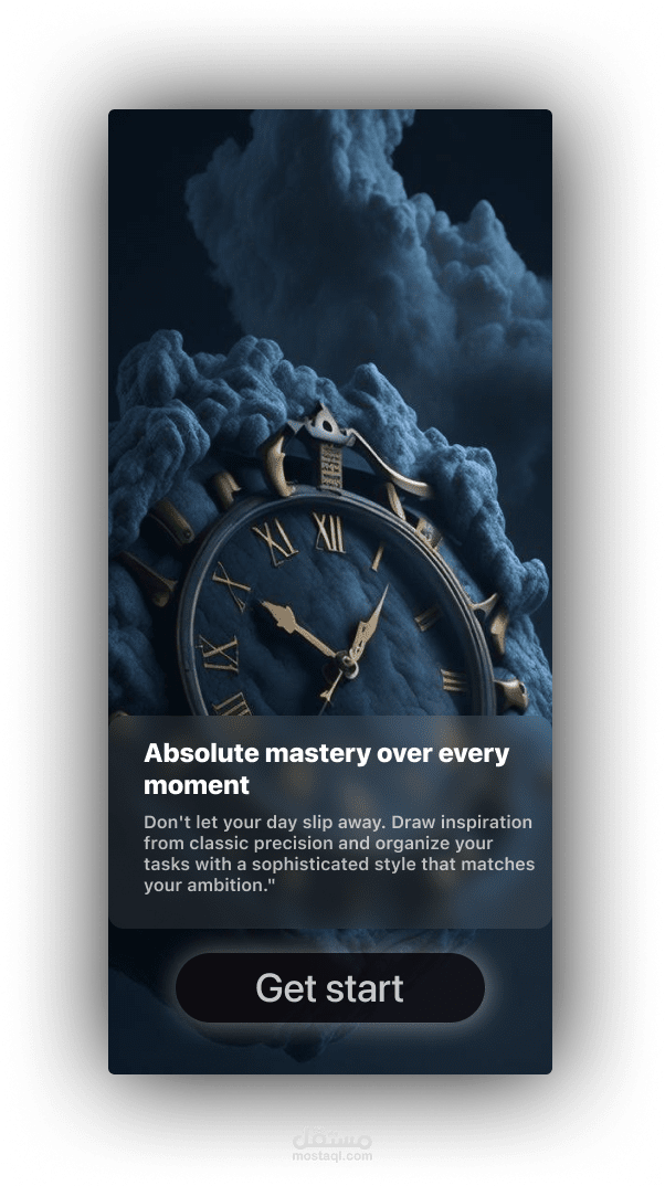 شاشة الترحيب (Onboarding): واجهة جذابة وفاخرة تعكس مفهوم التحكم بالوقت والإتقان، لتحفيز المستخدم من اللحظة الأولى.