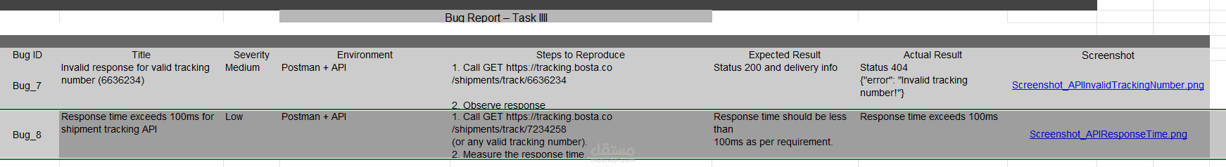 Performed manual testing and API testing for the Demoblaze e-commerce website and Bosta shipment tracking API as part of a QC Engineer assessment. Identified and documented multiple functional and performance issues using structured bug reports.