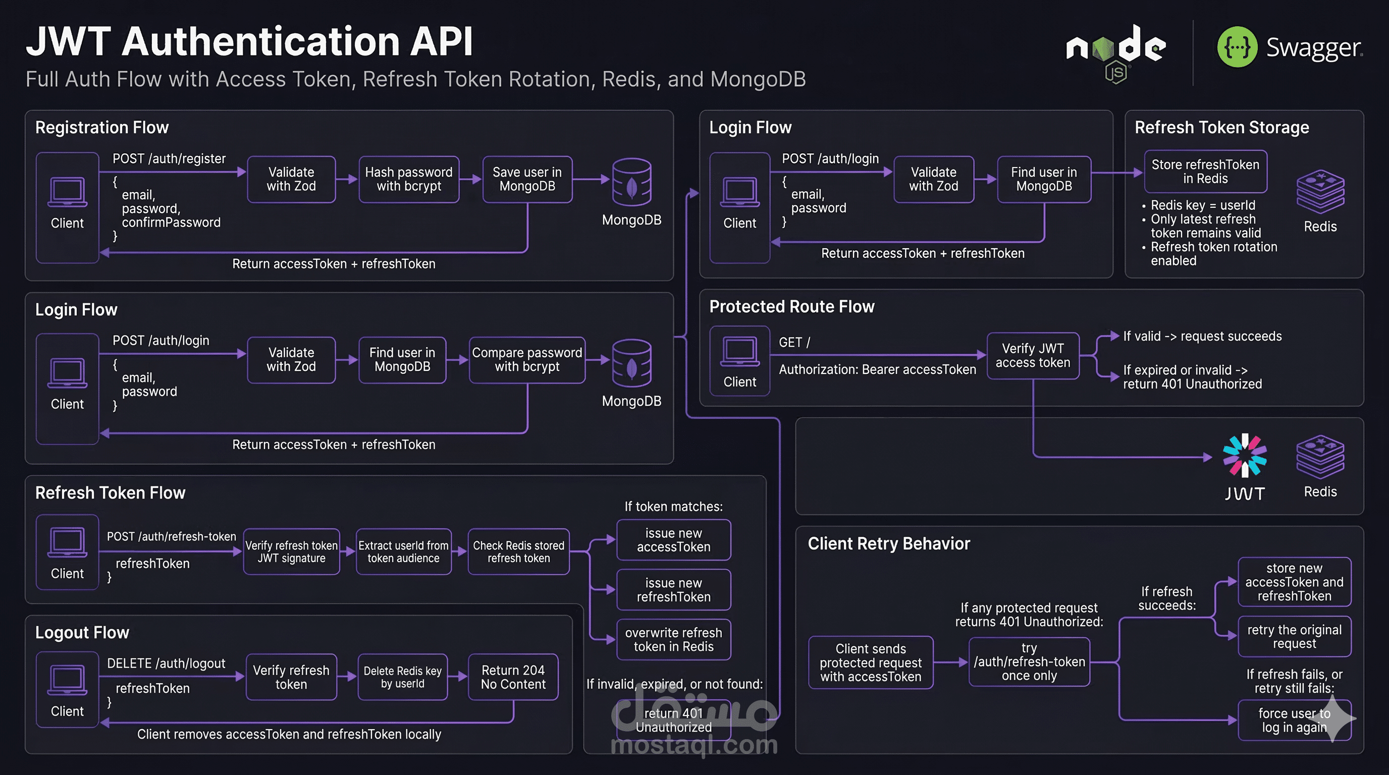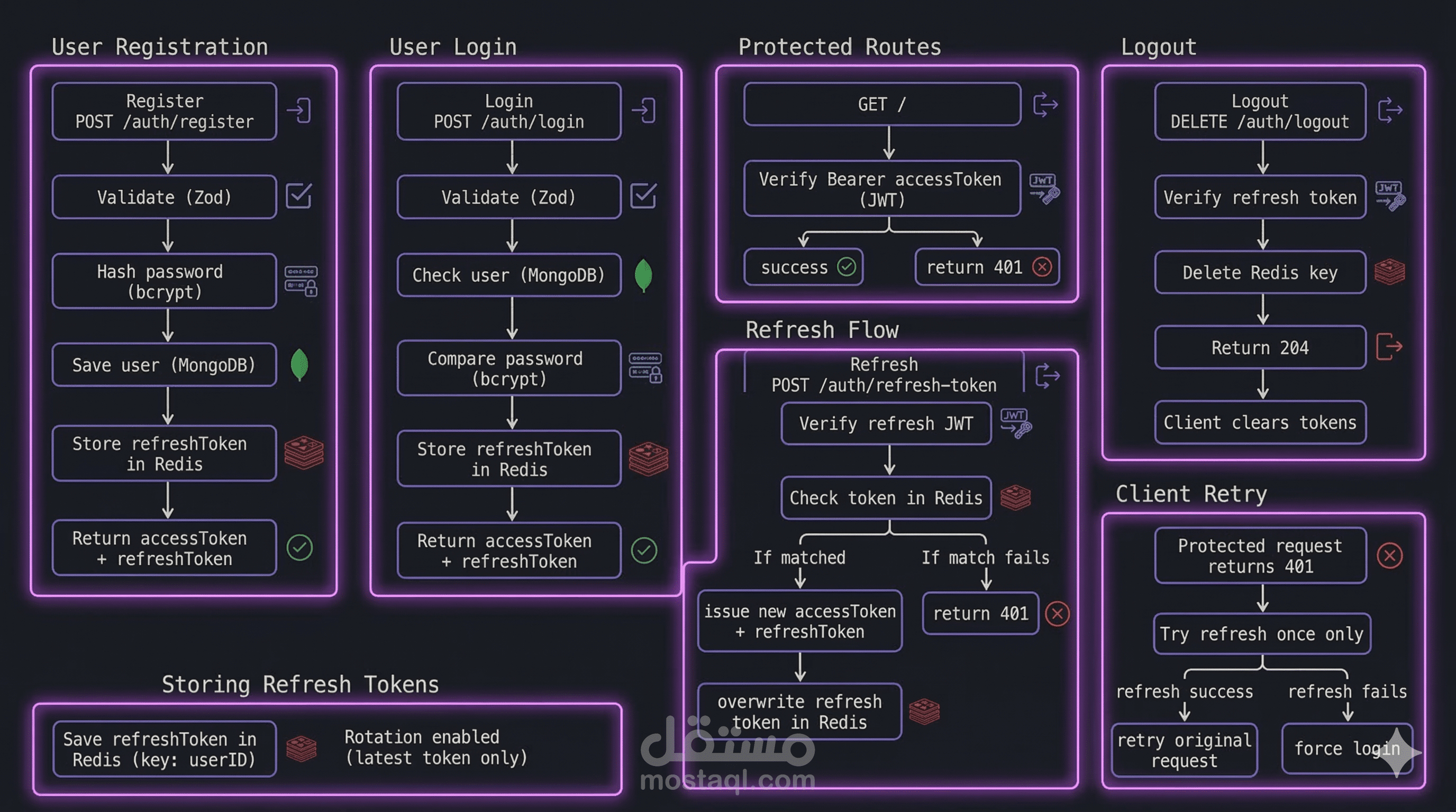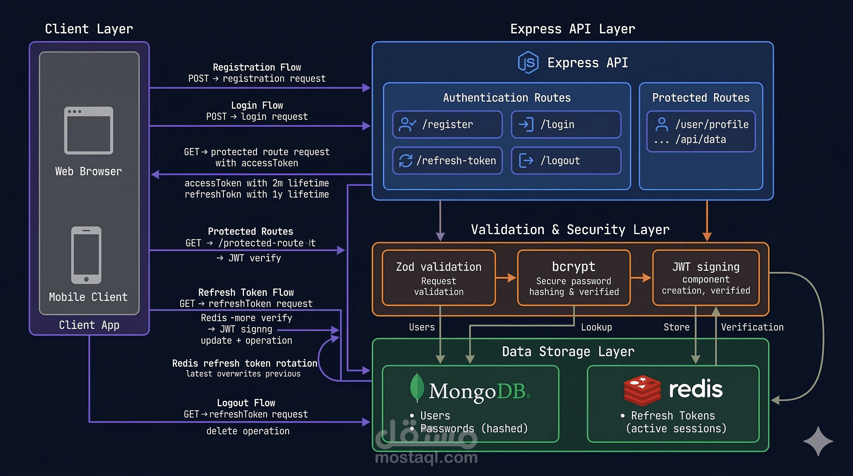 - تخزين وإدارة الـ Refresh Tokens عبر Redis للتحكم الفعلي في الجلسات.