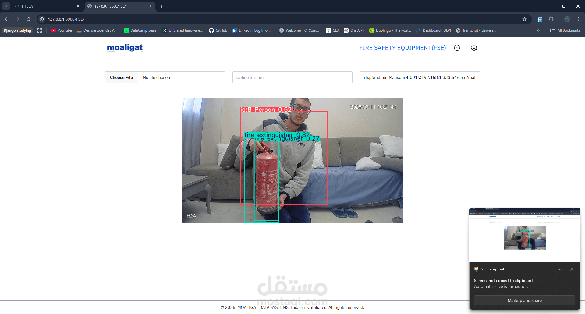 لقد قمت بإنشاء خادم باستخدام Django يقوم بتطبيق نماذج الذكاء الاصطناعي لاكتشاف الأجسام (Object Detection) على مقاطع الفيديو وبث الكاميرات. يقوم العميل بإرسال ملف الفيديو أو رابط البث من خلال المتصفح، ويتم إرسال بيانات الصناديق المحددة (Bounding Boxes) إلى خادم التحليلات.