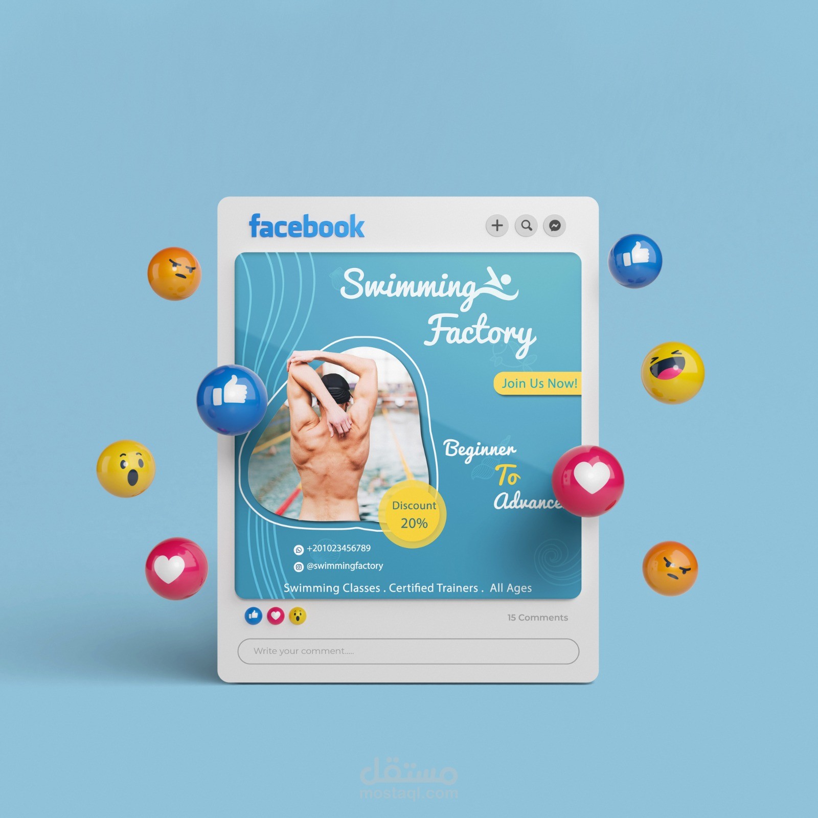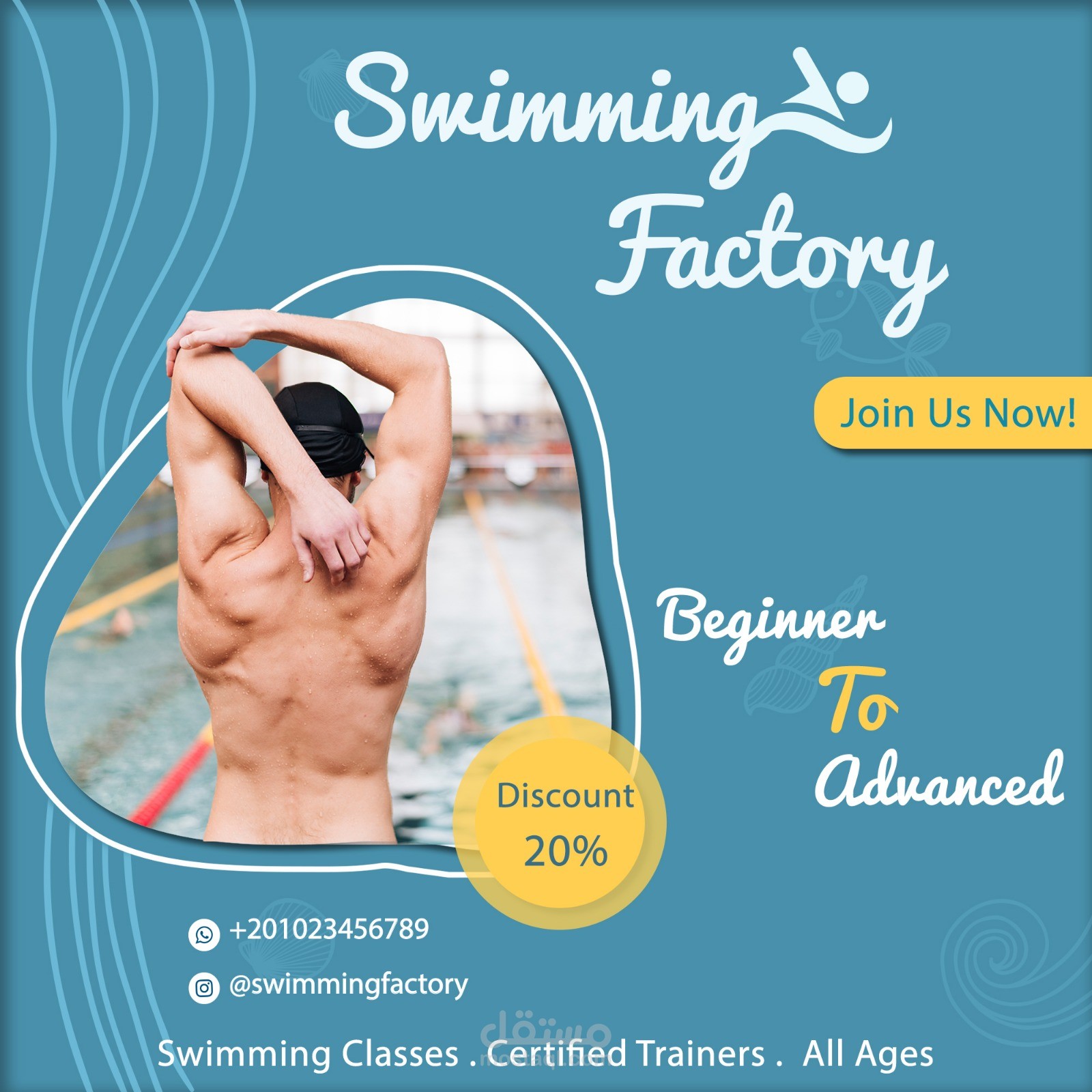 A vibrant social media advertisement designed for "Swimming Factory" academy. The design aims to boost registrations by highlighting academy features and special discounts in an engaging way.