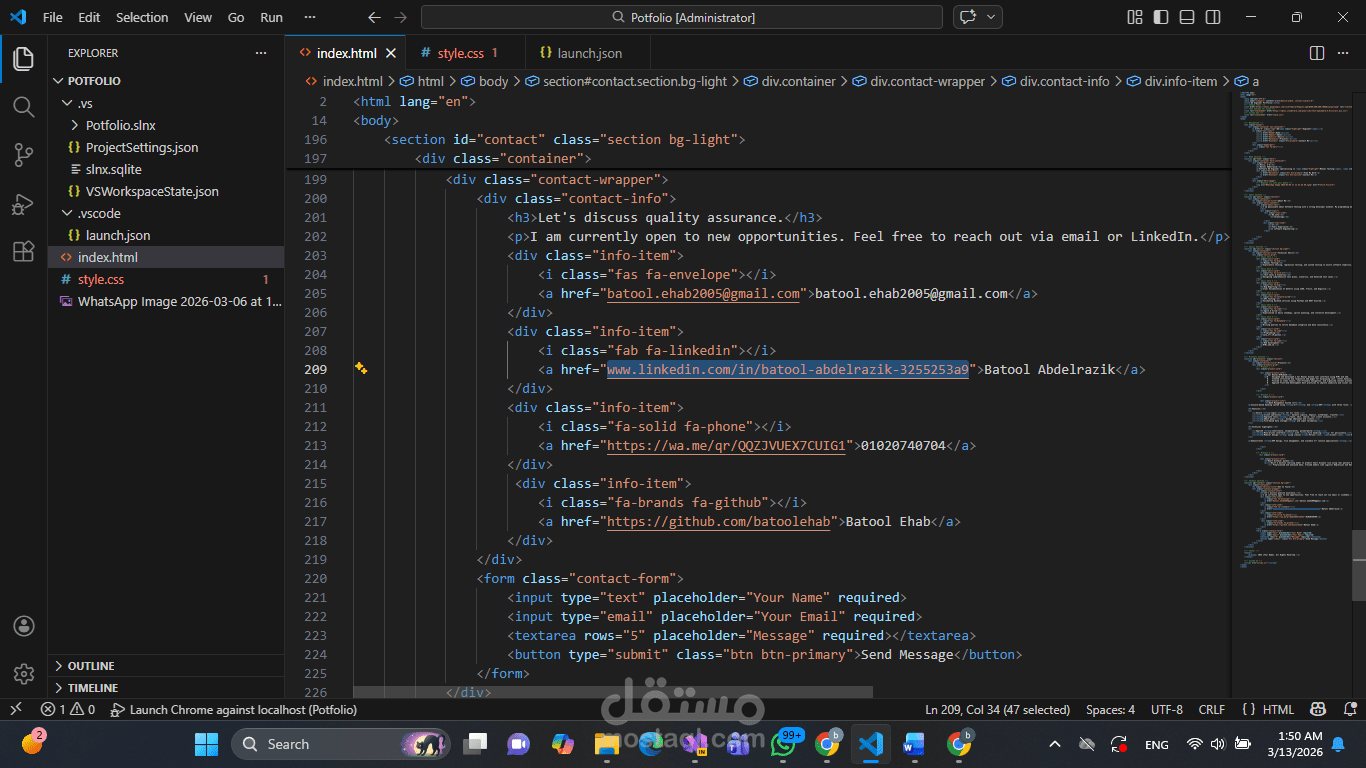 موقع بورتفوليو شخصي لعرض مهاراتي في مجال اختبار البرمجيات (QA). يتضمن الموقع معلومات عن المهارات التقنية، أساليب الاختبار، وقسم للتواصل. تم تطويره باستخدام HTML و CSS بتصميم بسيط ومتجاوب لعرض الأعمال بشكل احترافي.