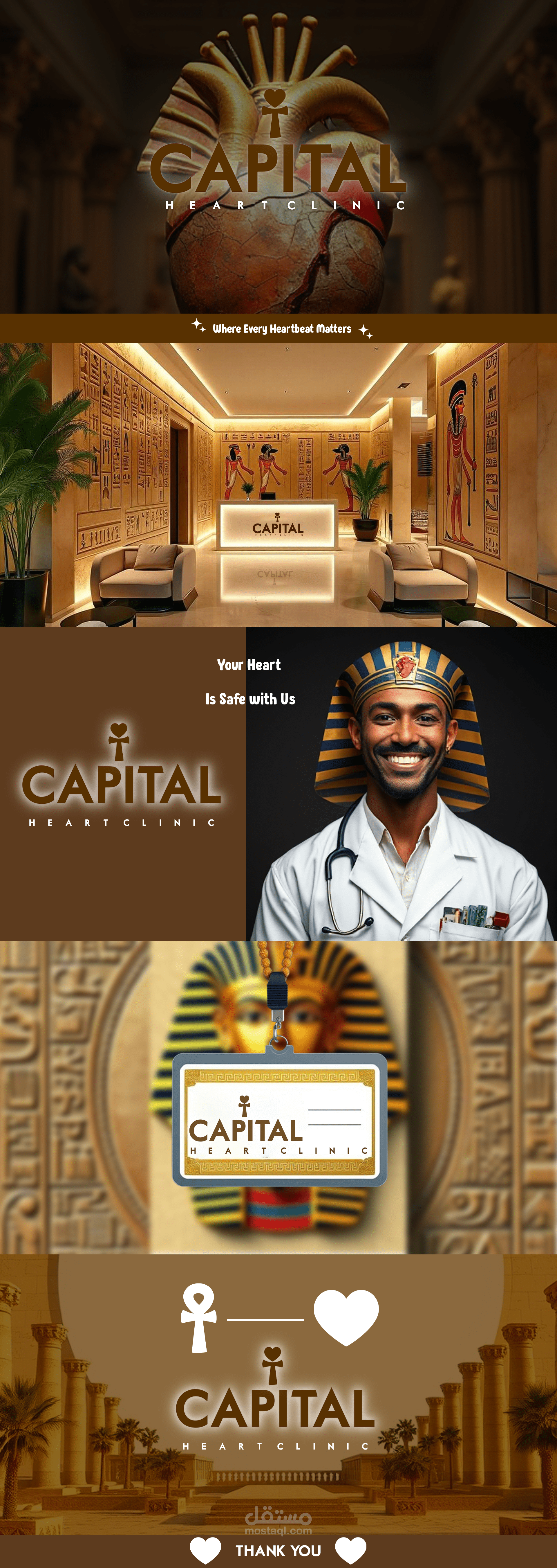 تعكس هوية Capital Heart Clinic مزيجًا فريدًا بين الطب الحديث والرمزية التاريخية للحضارة المصرية القديمة. استُلهم تصميم الشعار من رمز العنخ (Ankh) الذي كان يرمز للحياة في الحضارة الفرعونية، وتم دمجه مع رمز القلب ليعبر عن العناية بالحياة وصحة القلب. تعتمد الهوية على درجات اللون الذهبي والبني الدافئ التي توحي بالثقة والاحترافية، مع خلفيات مستوحاة من العمارة والنقوش المصرية القديمة لتعزيز الطابع الثقافي المميز. يهدف هذا التصميم إلى تقديم صورة قوية وموثوقة لعيادة متخصصة في رعاية القلب، تجمع بين الأصالة والابتكار في تقديم الرعاية الصحية.