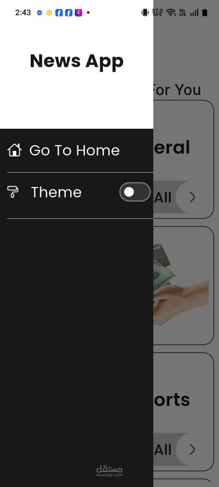 كما يحتوي التطبيق على Drawer يمكن من خلاله الرجوع إلى الصفحة الرئيسية أو تغيير الثيم بين الوضع الفاتح والوضع الداكن.
