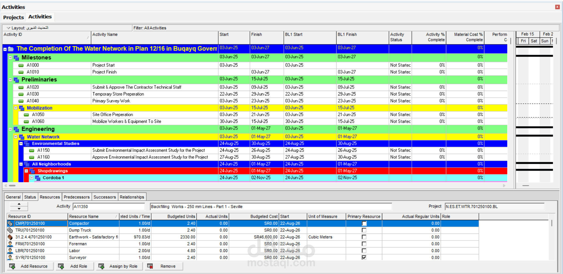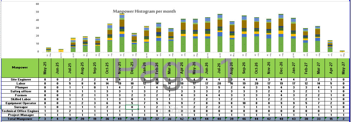 Resource Loading: Calculated and assigned manpower and equipment resources based on realistic productivity rates for excavation