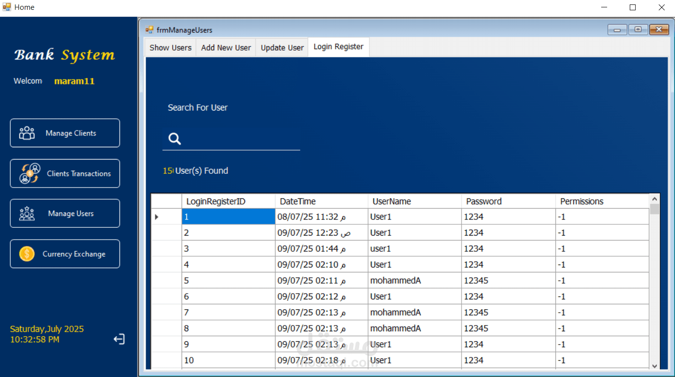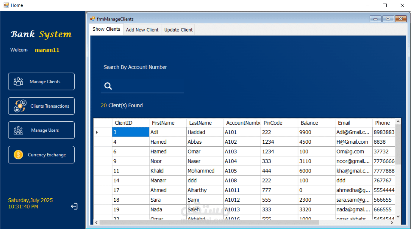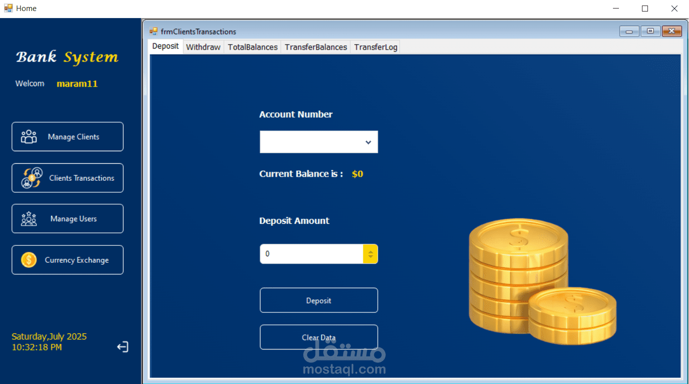 نظام لإدارة العمليات المصرفية مطور باستخدام C# بتقنية Windows Forms (WinForms) مع قاعدة بيانات Microsoft SQL Server وباعتماد Three‑Tier Architecture. يهدف النظام إلى تنظيم وإدارة العمليات اليومية داخل البنك من خلال واجهة مركزية تتيح إدارة العملاء والمستخدمين والمعاملات المالية بسهولة وأمان. يوفر النظام وظائف أساسية مثل تسجيل الدخول الآمن، إدارة حسابات العملاء، تنفيذ عمليات الإيداع والسحب والتحويل بين الحسابات مع التحقق من الأرصدة، وتتبع جميع العمليات عبر سجل التحويلات. كما يتضمن إدارة المستخدمين بنظام صلاحيات للتحكم في الوصول إلى الوظائف المختلفة، بالإضافة إلى وحدة لتحويل العملات تتضمن تحديث أسعار الصرف وحاسبة لتحويل العملات. يساعد هذا النظام على تحسين دقة البيانات وتسريع تنفيذ العمليات المصرفية ضمن بيئة منظمة وآمنة.