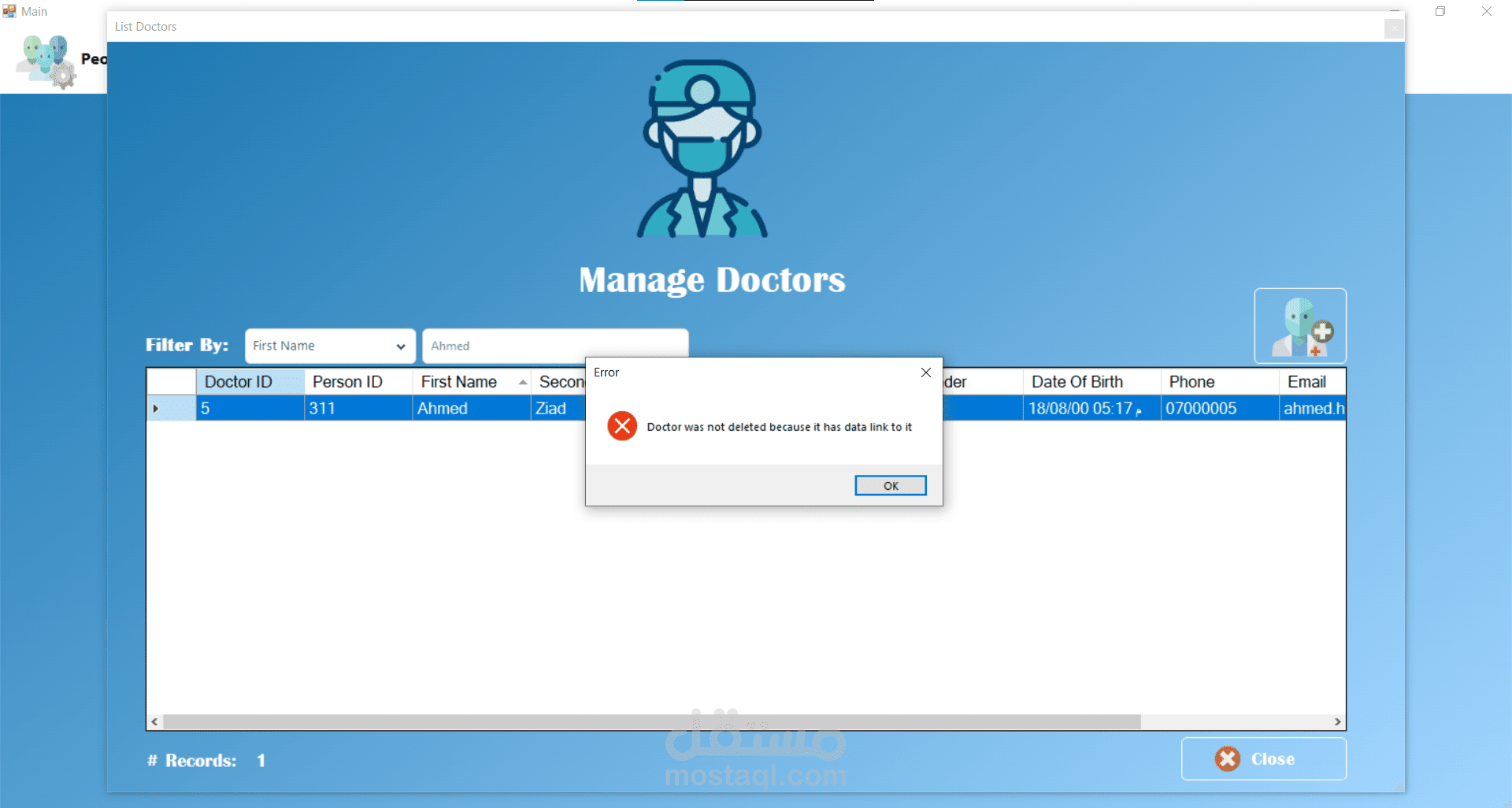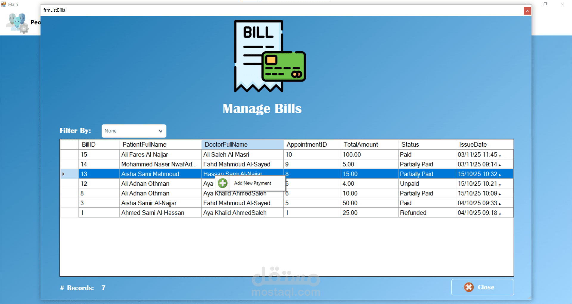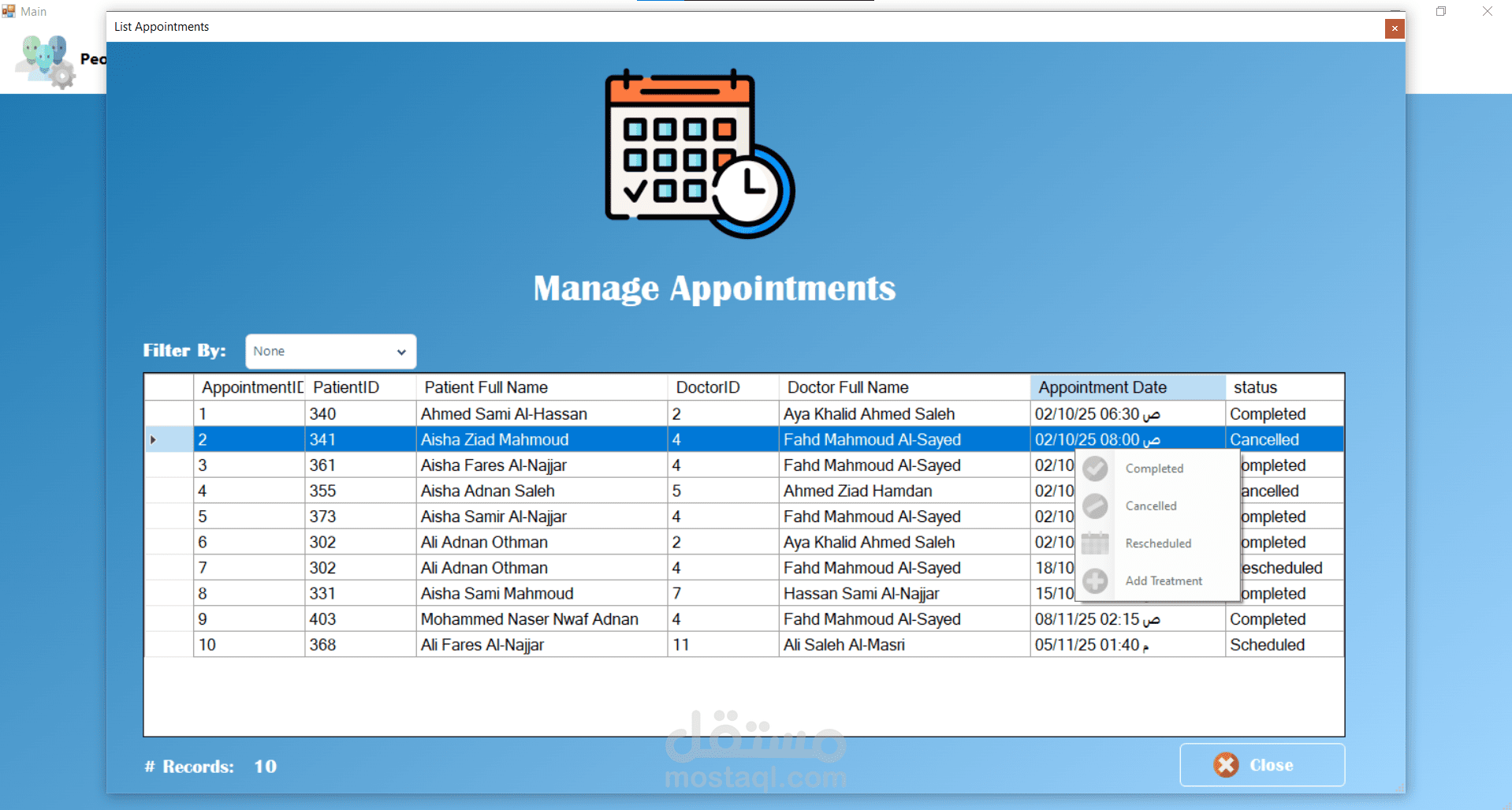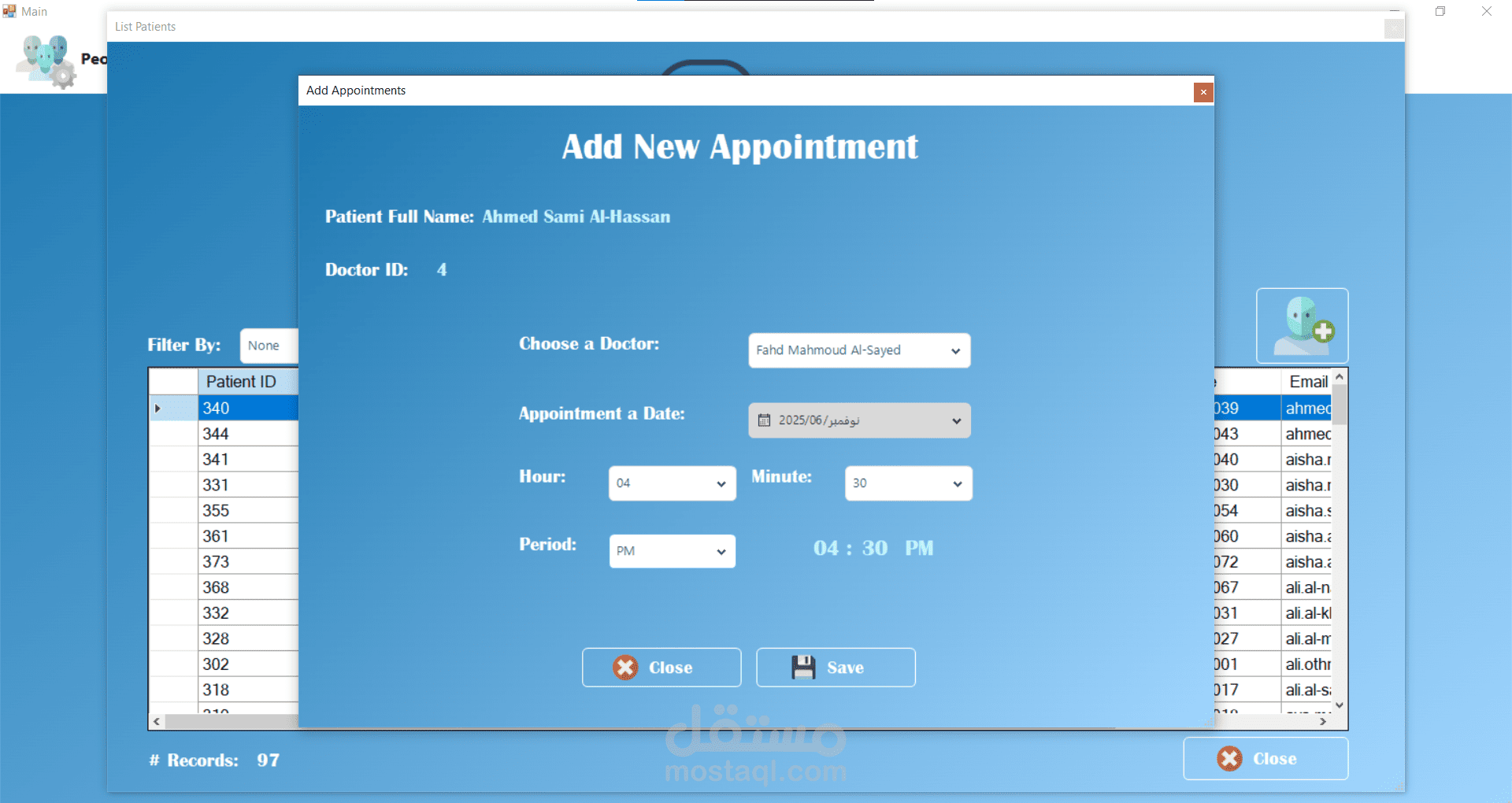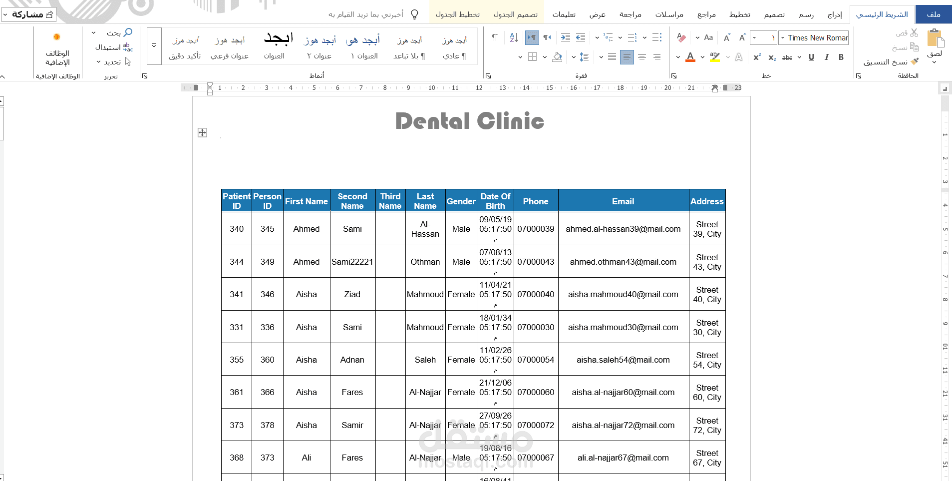 من الناحية التقنية تم تصميم قاعدة البيانات باستخدام Microsoft SQL Server مع اعتماد مبدأ التعميم (Generalization) عبر جدول People الذي يُستخدم كأساس لتمثيل المرضى والأطباء والمستخدمين. وفي موقع الويب تم استخدام معاملات Transaction لضمان تكامل البيانات عند تسجيل المريض الجديد، حيث يتم إدخال البيانات في جدول الأشخاص ثم إنشاء سجل المريض المرتبط بنفس المعرف داخل عملية واحدة تضمن تنفيذ جميع الخطوات أو التراجع عنها بالكامل في حال حدوث خطأ.