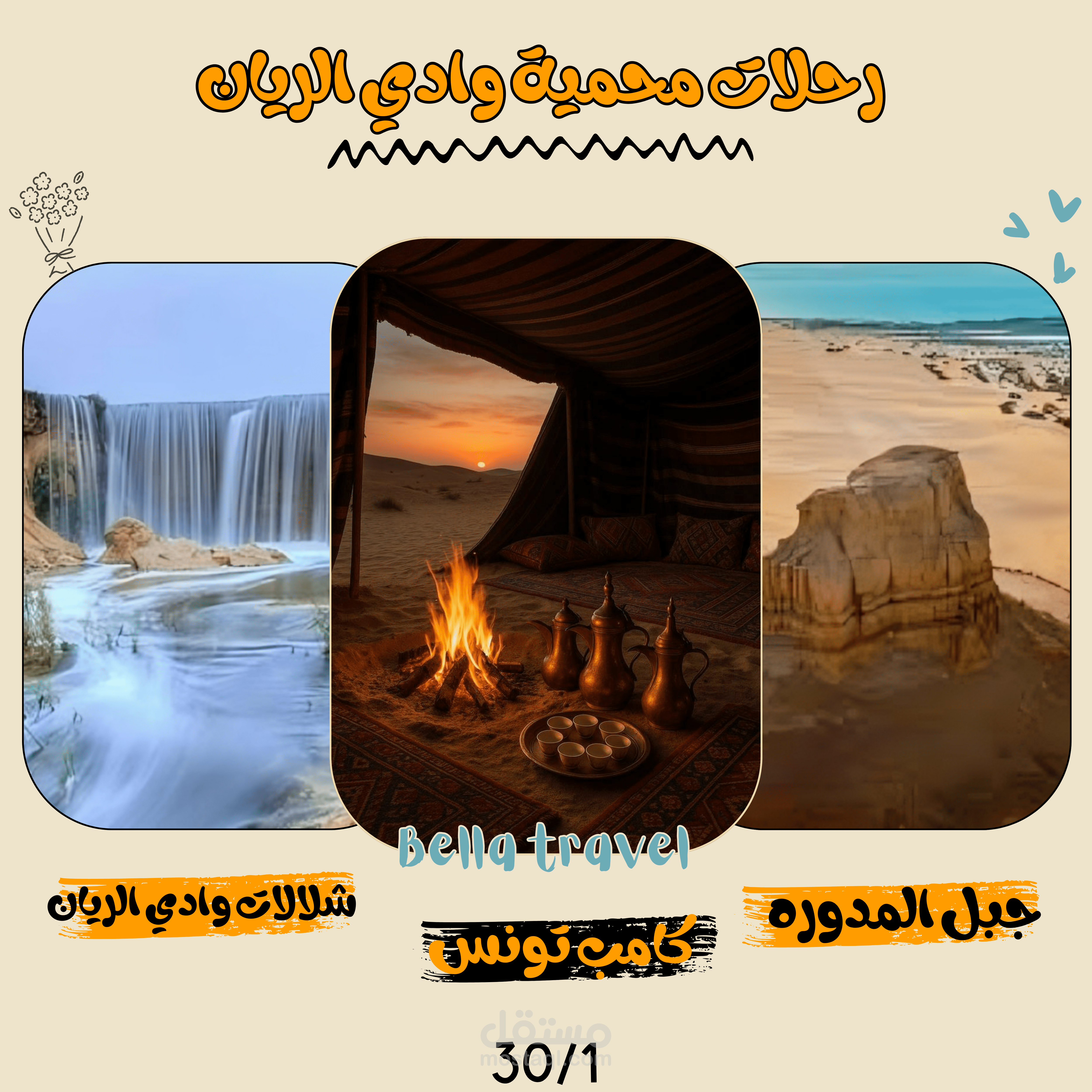 تصميم إعلاني يعرض برنامج رحلة إلى محمية وادي الريان، حيث يبرز أهم الأنشطة مثل مشاهدة شلالات وادي الريان، جلسة كاب تونسي في الصحراء، وزيارة جبل المدورة. يعتمد التصميم على صور طبيعية وعناصر بسيطة تعكس أجواء المغامرة والاستمتاع بالطبيعة.