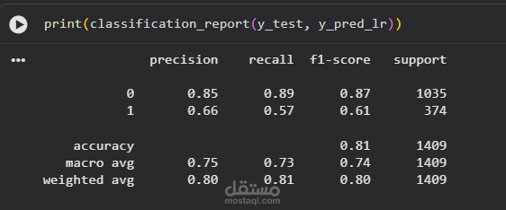 النموذج بعد التدريب يقدر يتوقع العملاء الأكثر عرضة للمغادرة، وده بيساعد الشركات إنها تتدخل بعروض أو حلول للحفاظ عليهم وتقليل خسارة العملاء.