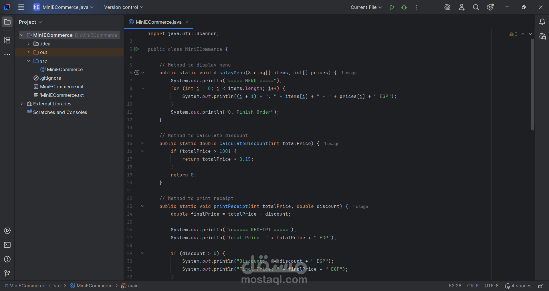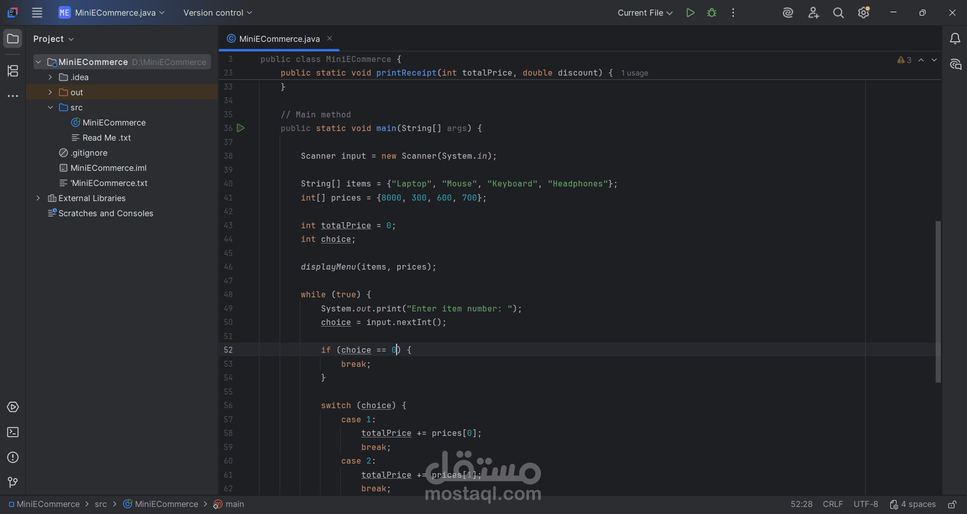 المتجر ذكي : هو عباره عن متجر ألكترونيات صغير و محدود المنتجات ( لابتوب , فأره , كيبورد , سماعة رأس ) , فقد على العميل ان يدخل للمتجر و يطلب منتجاً و سيحصل على تخفيضاً ( خصماً ) ستحصل على هذا المشروع عن طريق ملف سورس كود (source code)