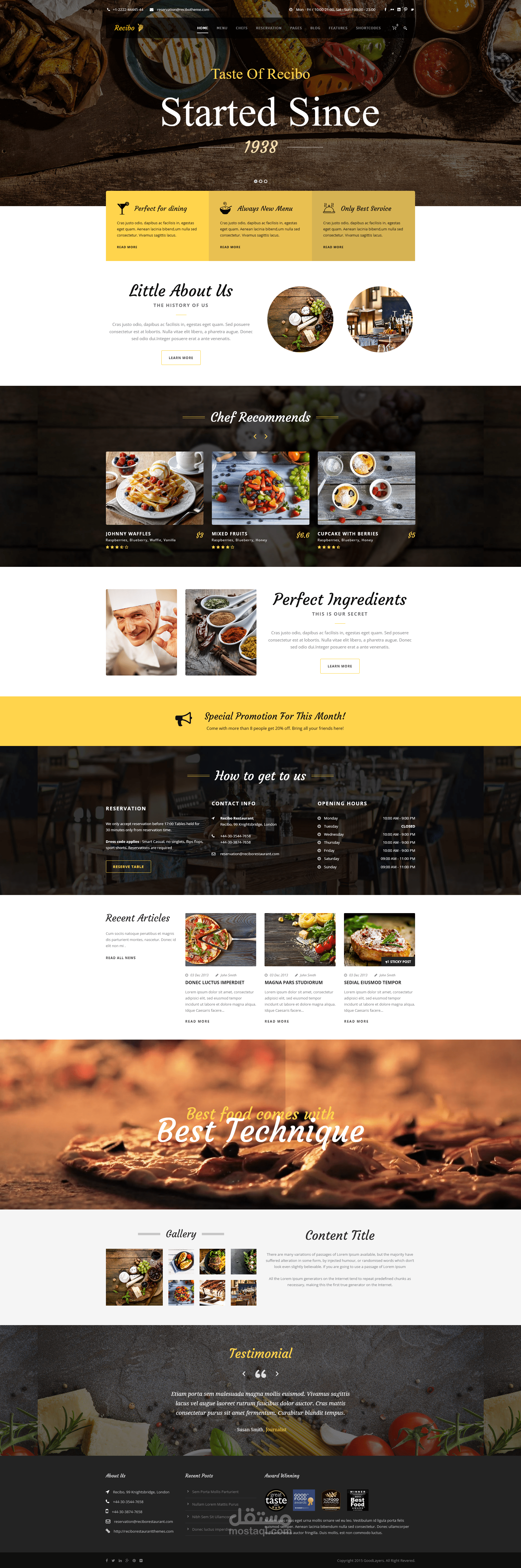 بطاقات الميزات )Highlight Cards): تصميم أقسام متميزة بخلفية ذهبية هادئة لعرض نقاط القوة (Perfect for dining, Always New Menu, Best Service) بشكل يسهل قراءته وسرعة استيعابه.