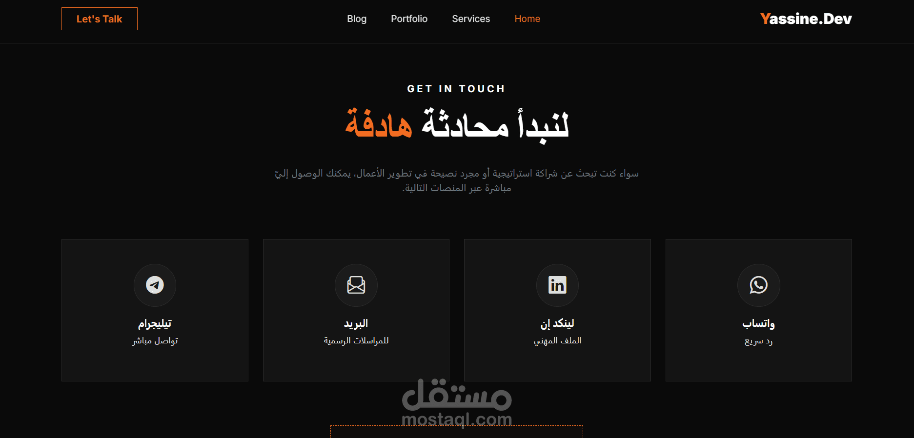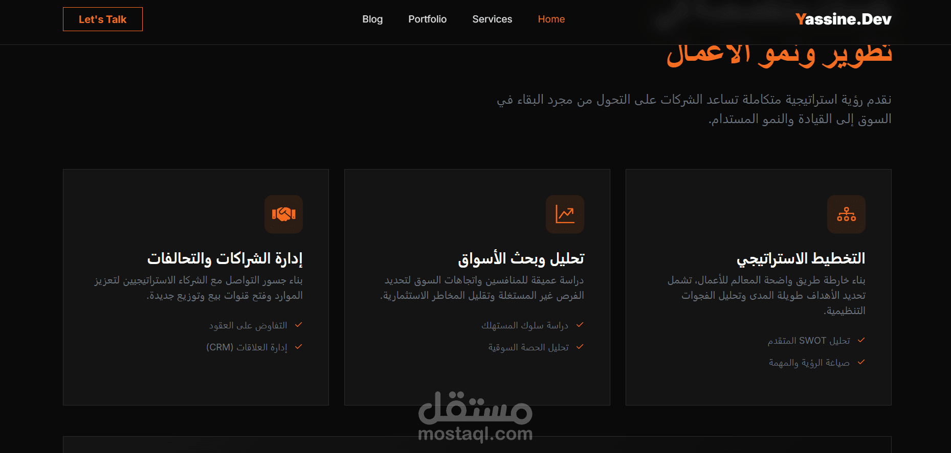 This project is a high-end Business Development Portfolio designed to establish a powerful digital presence for strategic consultants. Built with a sleek, modern Dark Mode aesthetic, the platform focuses on clarity and professional authority. The architecture is strategically divided into several key modules: a high-impact Hero Section that immediately defines the value proposition, and a Services Grid that showcases core competencies like Strategic Planning and Market Research through interactive, user-friendly components. Furthermore, the project features a dedicated Insights/Blog engine, designed to showcase thought leadership and improve SEO by sharing industry-specific articles. To drive conversions, a streamlined "Get In Touch" interface is integrated, providing direct API-linked shortcuts to professional communication channels such as LinkedIn, WhatsApp, and Email. The entire interface is fully responsive, ensuring a seamless experience across mobile and desktop devices, making it an essential tool for lead generation and brand positioning in the business development sector.
