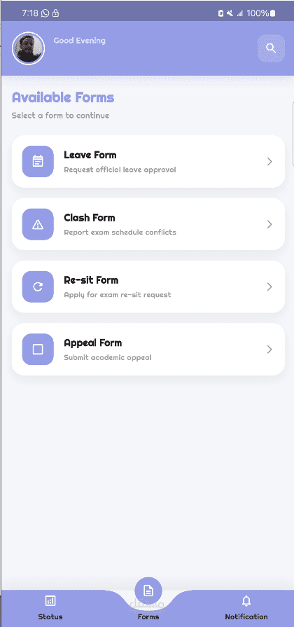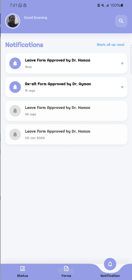 Digital platform for managing university student requests efficiently. Enables students to submit requests (exam re-sit, exam schedule conflicts, official leave, academic appeals), track their status, and receive approval or rejection from teachers and deans through the system instead of manual processes.