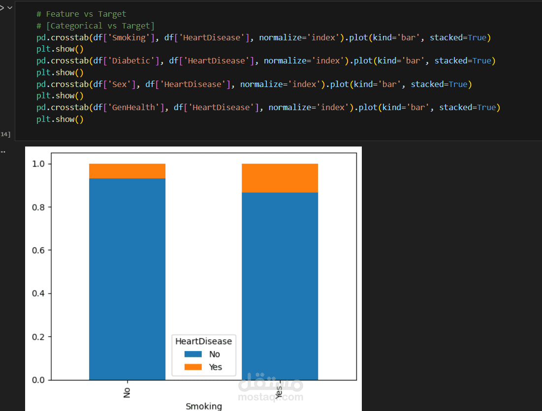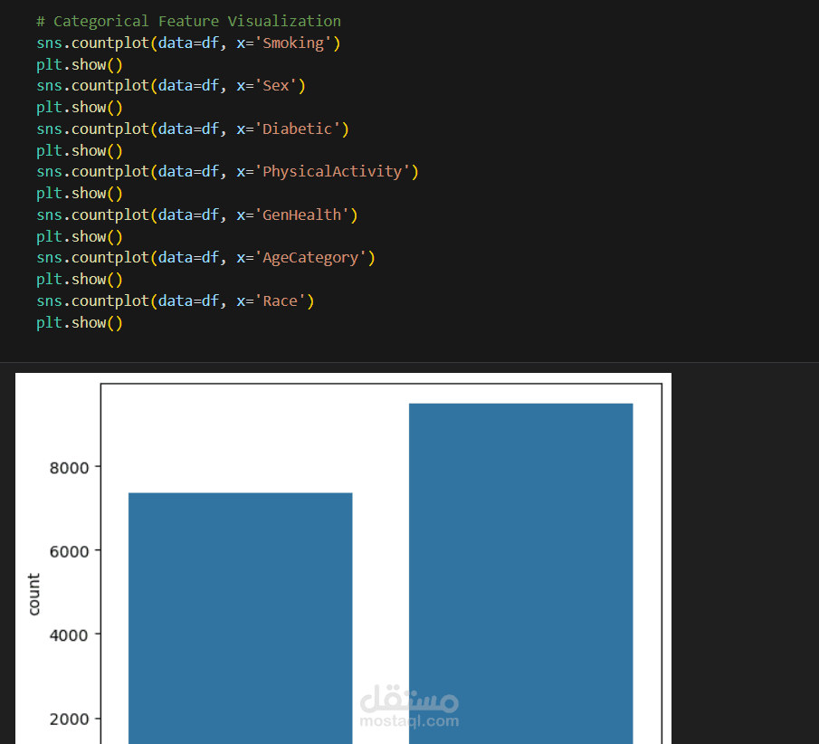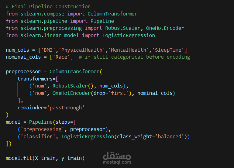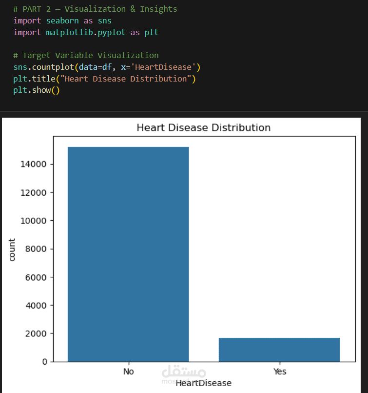 في هذا المشروع قمت بإنشاء **دراسة حالة للتنبؤ بأمراض القلب باستخدام التعلم الآلي**، حيث بدأت أولًا بعرض نظرة عامة على مجموعة البيانات المستخدمة، مثل عدد المرضى الموجودين في البيانات وعدد الخصائص الطبية، بالإضافة إلى المتغير الهدف الذي يحدد ما إذا كان المريض مصابًا بمرض في القلب أم لا. بعد ذلك قمت بمرحلة **معالجة البيانات المسبقة**، حيث تعاملت مع القيم المفقودة وقمت بتحويل المتغيرات الفئوية باستخدام تقنيات مثل **Label Encoding** و **One-Hot Encoding**، ثم قمت بتقسيم البيانات إلى مجموعة تدريب ومجموعة اختبار من أجل تدريب النموذج وتقييمه بشكل صحيح.