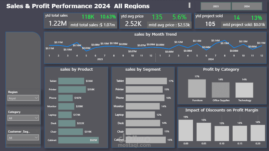Interactive Power BI dashboard for analyzing sales performance, profit margins, customer segments, and regional sales trends with dynamic filters and KPI indicators.