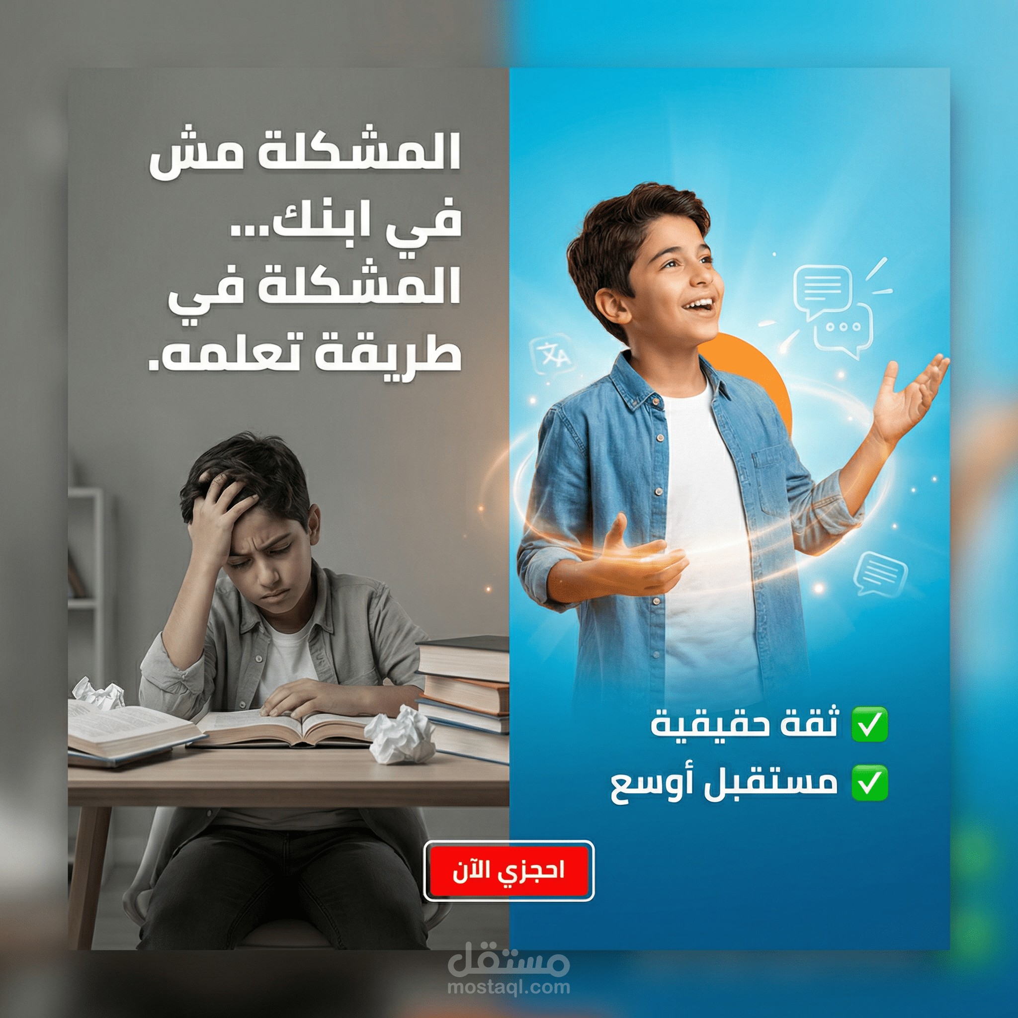 Contrast Storytelling: استخدام أسلوب المقارنة البصرية (Split Screen) بين الإحباط الناتج عن الطرق التقليدية، وبين الانطلاق والثقة مع منهج الأكاديمية.