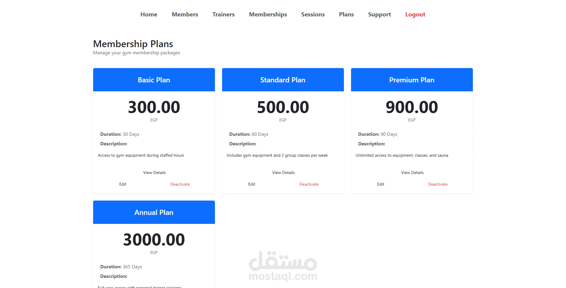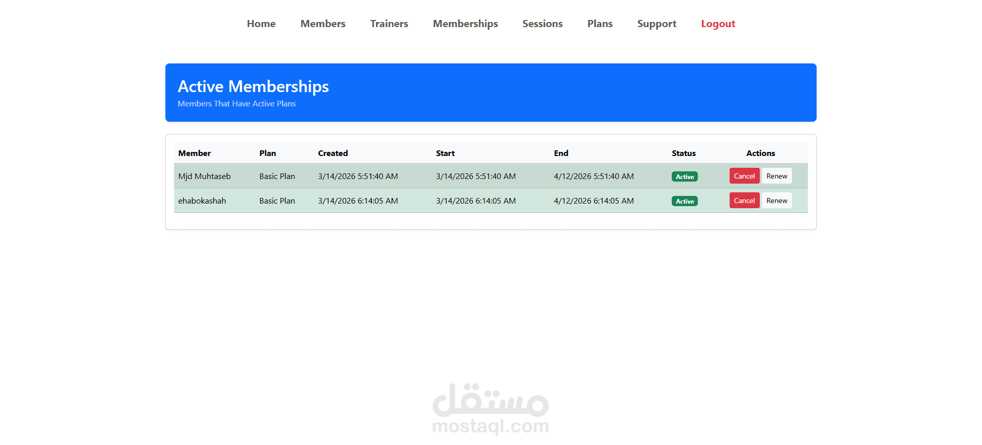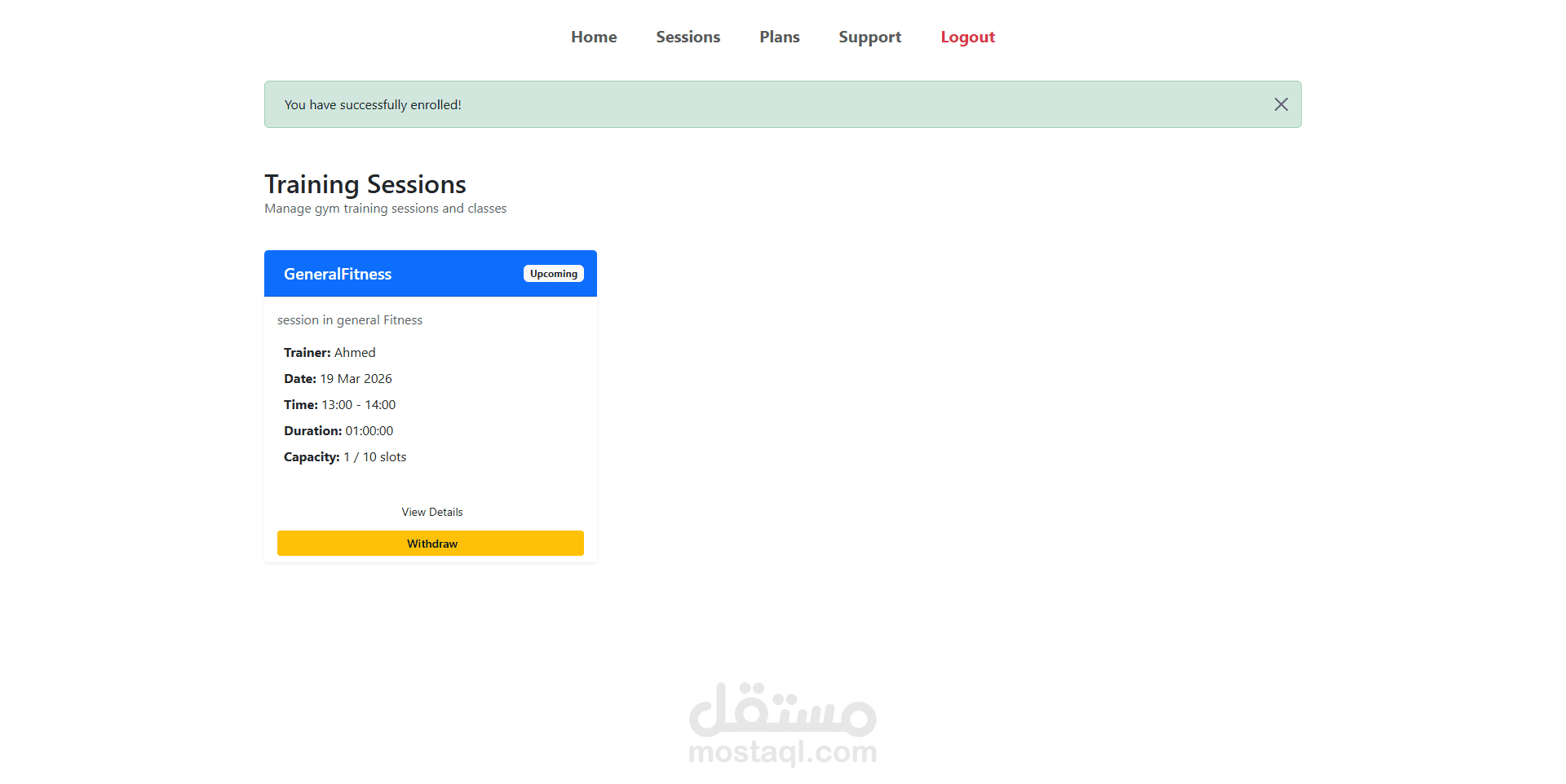 منصة لإدارة الجيم (Gym Management System)، بتساعد المشتركين على متابعة خططهم التدريبية وعضوياتهم، وإدارة الحصص (Sessions) مع المدربين.