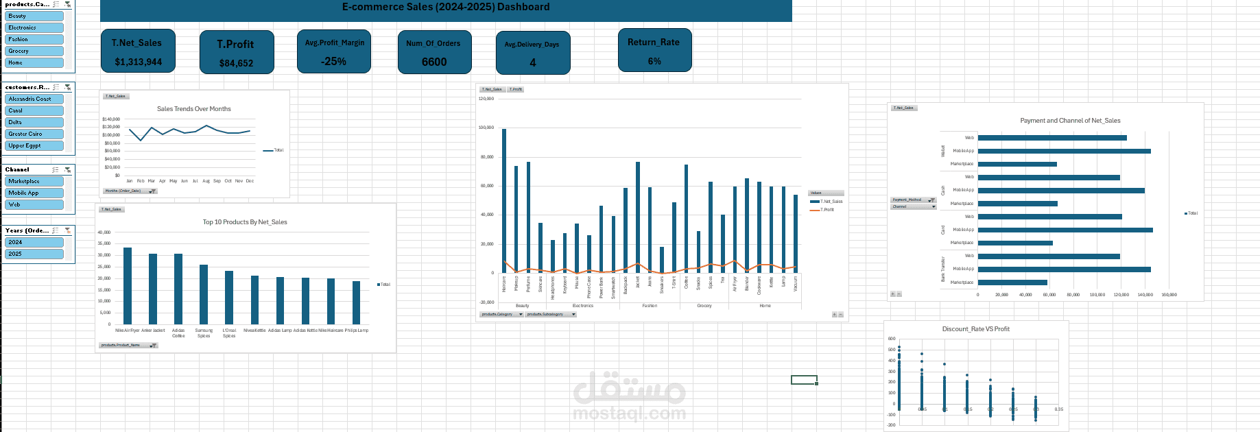 قمت بتنفيذ مشروع تحليل بيانات لمبيعات متجر إلكتروني (E-commerce) للفترة 2024–2025 باستخدام Microsoft Excel وPower Query بهدف تنظيف البيانات، إعدادها للتحليل، وبناء لوحة معلومات (Dashboard) تفاعلية تساعد في فهم أداء المبيعات والربحية واتخاذ قرارات مبنية على البيانات.