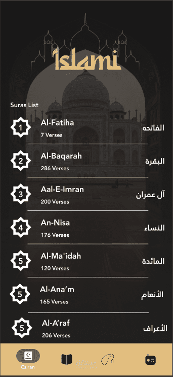 قمت بتصميم وتطوير تطبيق إسلامي للهواتف الذكية يهدف إلى تسهيل الوصول إلى المحتوى الديني بشكل بسيط وجذاب. يتضمن التطبيق عدة أقسام مثل عرض سور القرآن الكريم مع تفاصيل الآيات، قسم الأحاديث النبوية، سبحة إلكترونية للتسبيح، بالإضافة إلى راديو إسلامي للاستماع إلى القراء والمحتوى الديني.