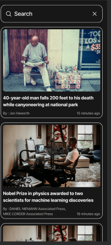 يتضمن التطبيق نظام بحث للعثور على الأخبار بسرعة، بالإضافة إلى دعم الوضع الداكن (Dark Mode) لتحسين تجربة المستخدم. كما تم تصميم واجهة المستخدم بشكل متجاوب لتناسب مختلف أحجام الشاشات.