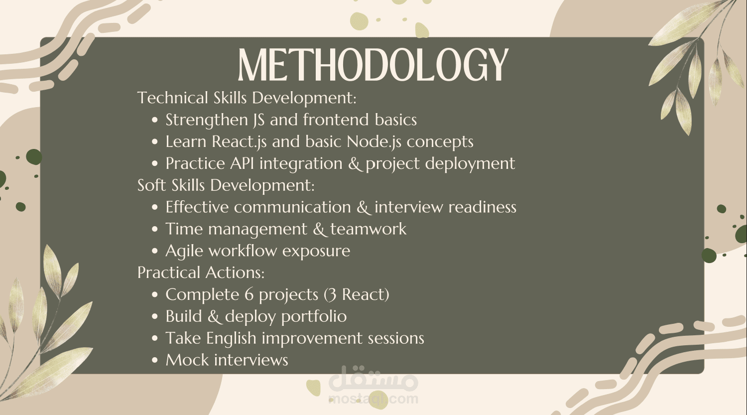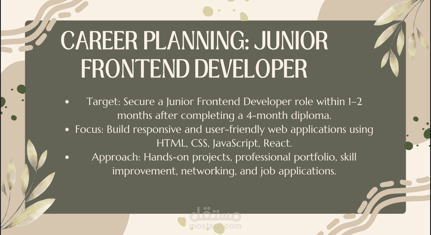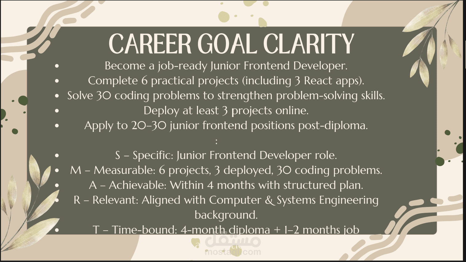 كما تشمل الخطة تحديد المجالات التي أطمح للعمل بها، ووضع خطوات عملية لاكتساب الخبرة وبناء معرض أعمال قوي يساعدني على تقديم خدمات احترافية للعملاء وتحقيق نمو مهني مستمر.