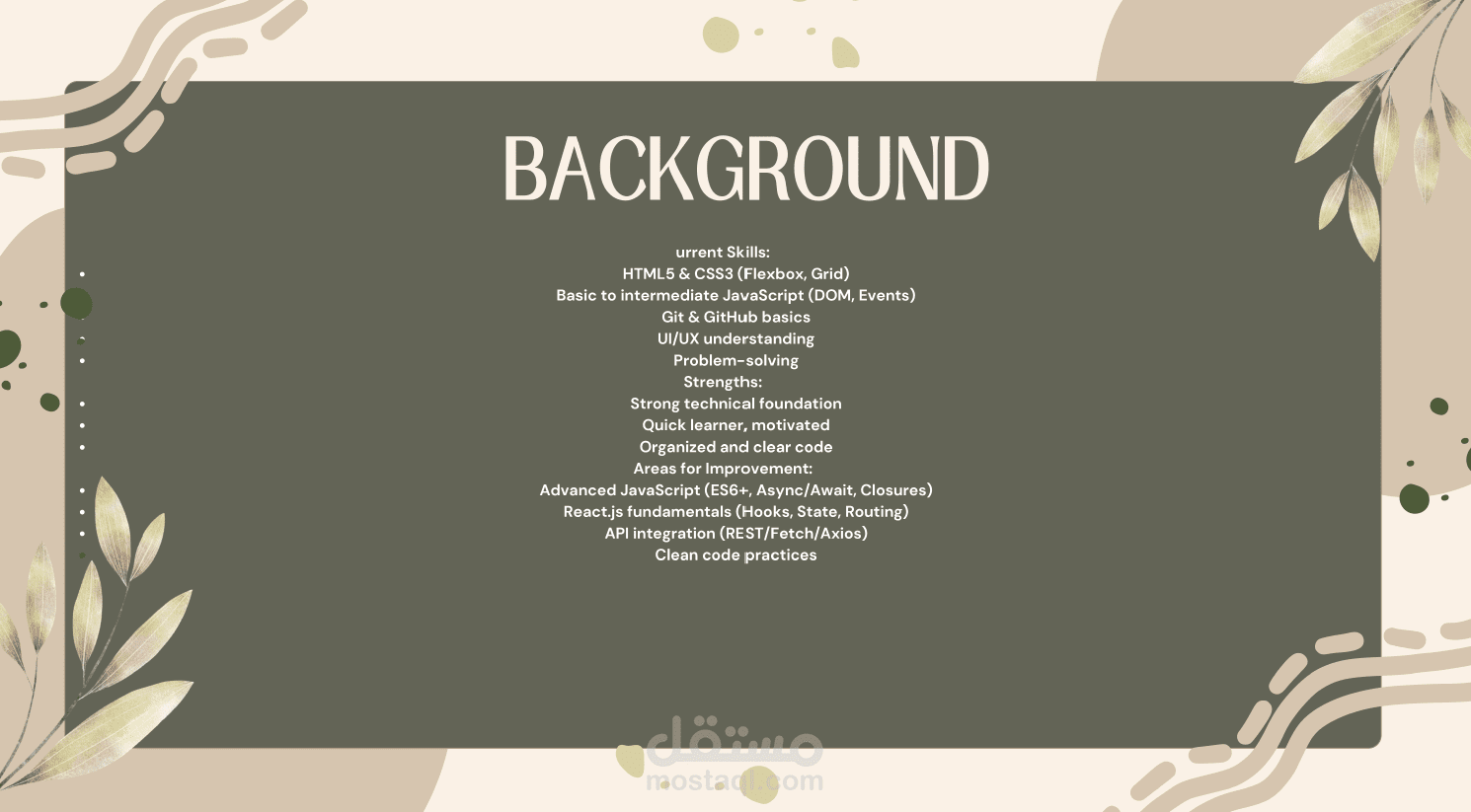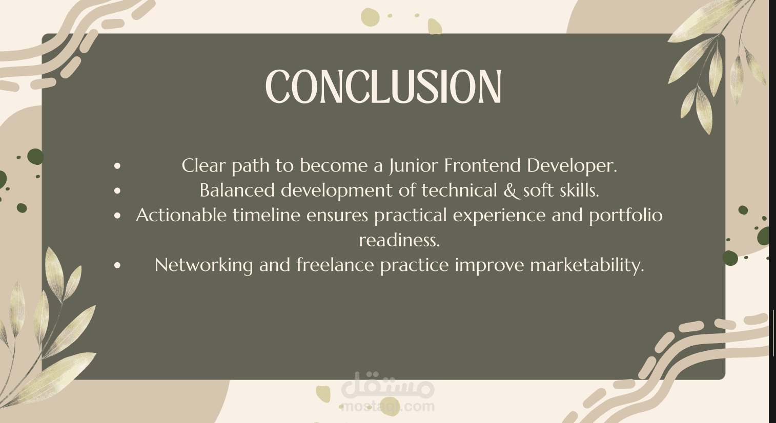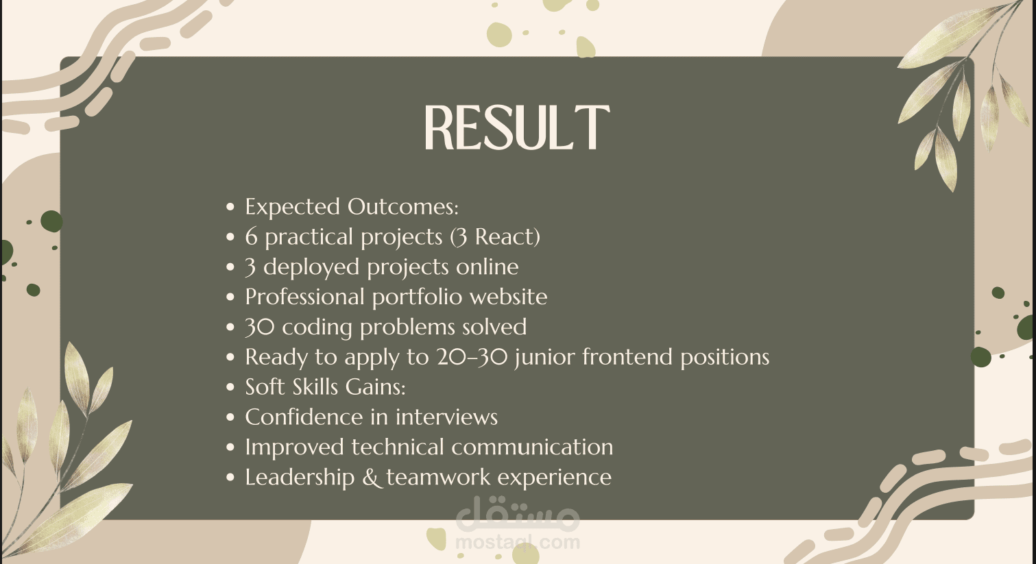 كما تشمل الخطة تحديد المجالات التي أطمح للعمل بها، ووضع خطوات عملية لاكتساب الخبرة وبناء معرض أعمال قوي يساعدني على تقديم خدمات احترافية للعملاء وتحقيق نمو مهني مستمر.