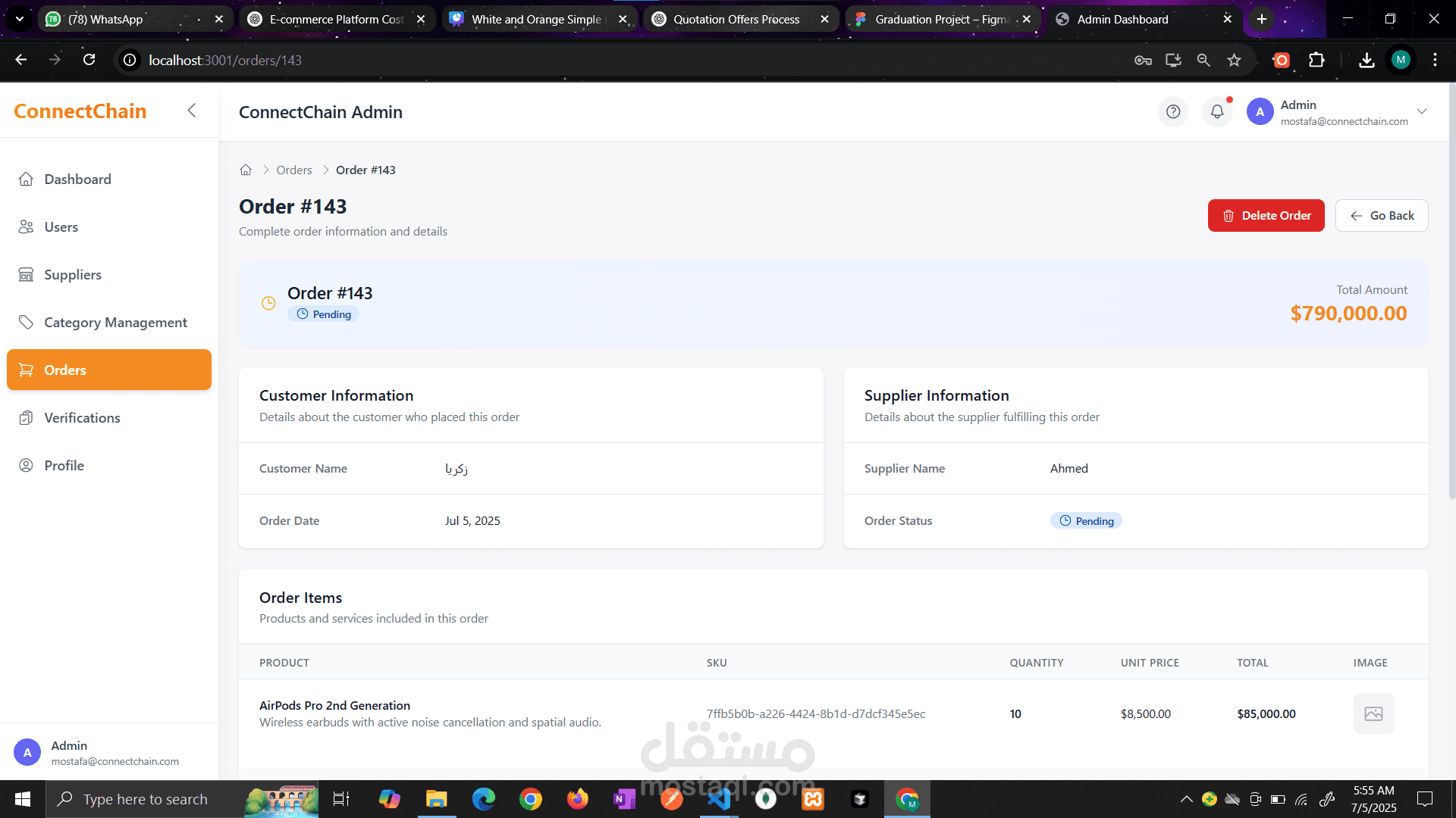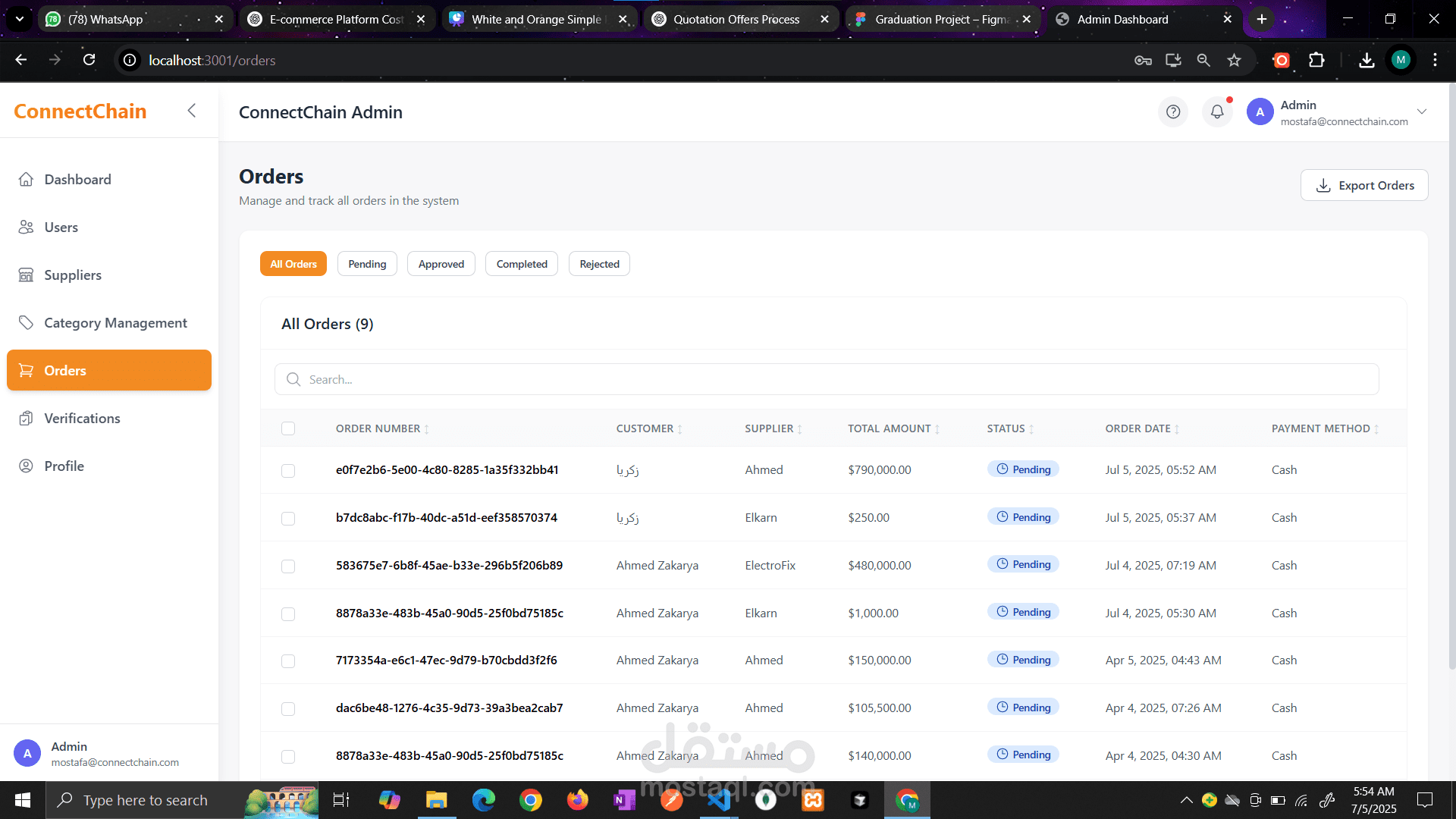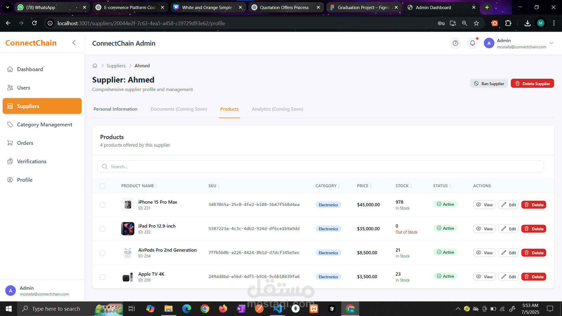 Admin Web Application لمنصة ConnectChain B2B علشان تساعد الأدمنز يراقبوا نشاط المنصة ويديروا التجار والموردين بشكل سهل وفعال. بنيت dashboard باستخدام React متصلة بـ Node.js backend باستخدام Prisma و MSSQL، ووفرت مميزات زي إدارة المستخدمين، التحقق من الموردين، التحكم في الحسابات، متابعة الطلبات، وعرض تحليلات المبيعات. الحل ده وفر نظام مركزي يقدر الأدمن من خلاله يدير عمليات المنصة بكفاءة، ويحسن استقرار النظام، ويضمن تعاملات منظمة وآمنة بين الموردين وأصحاب المحلات.
