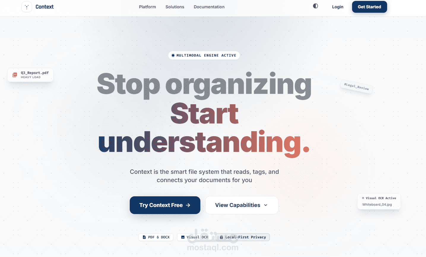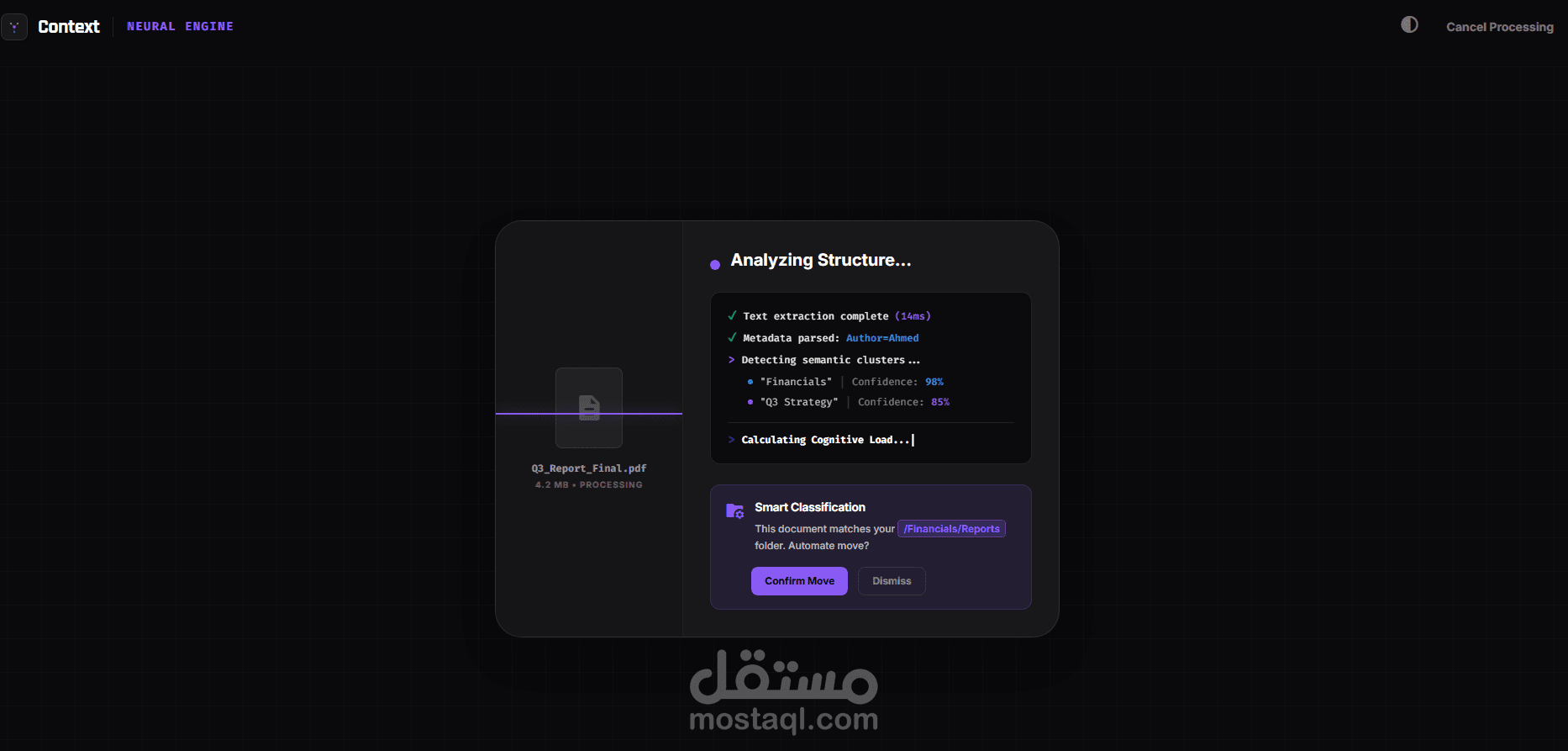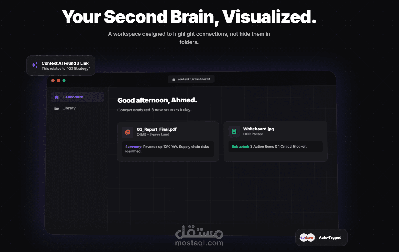 مشروع "Context" هو تطبيق ويب متقدم يعمل كمحرك معالجة دلالي . يهدف المشروع إلى استبدال نظام المجلدات التقليدي بنظام ملفات ذكي يعتمد على الفهم الدلالي لمحتوى المستندات، مما يساهم في تبسيط وتطوير سير العمل الحديث للشركات والأفراد.
