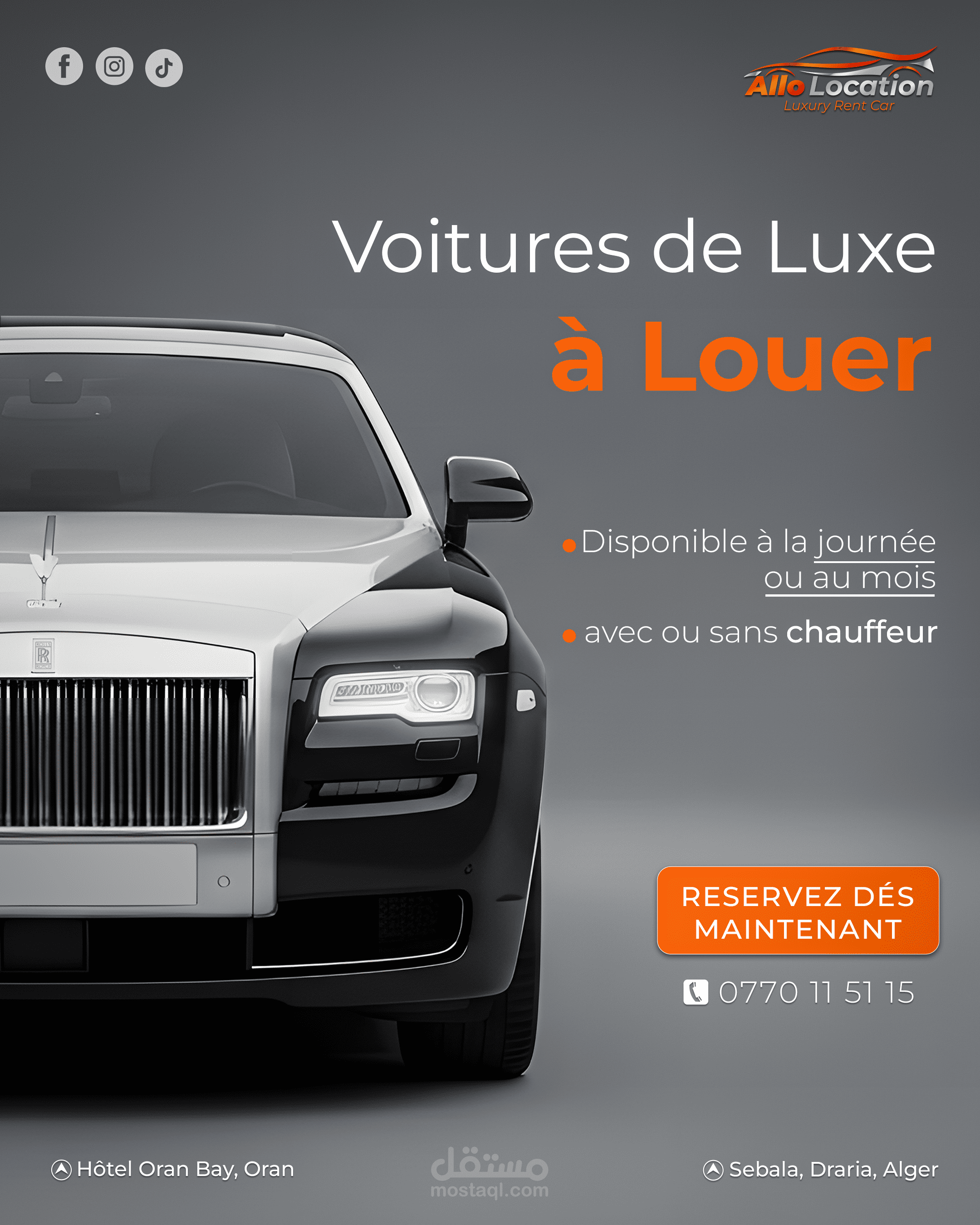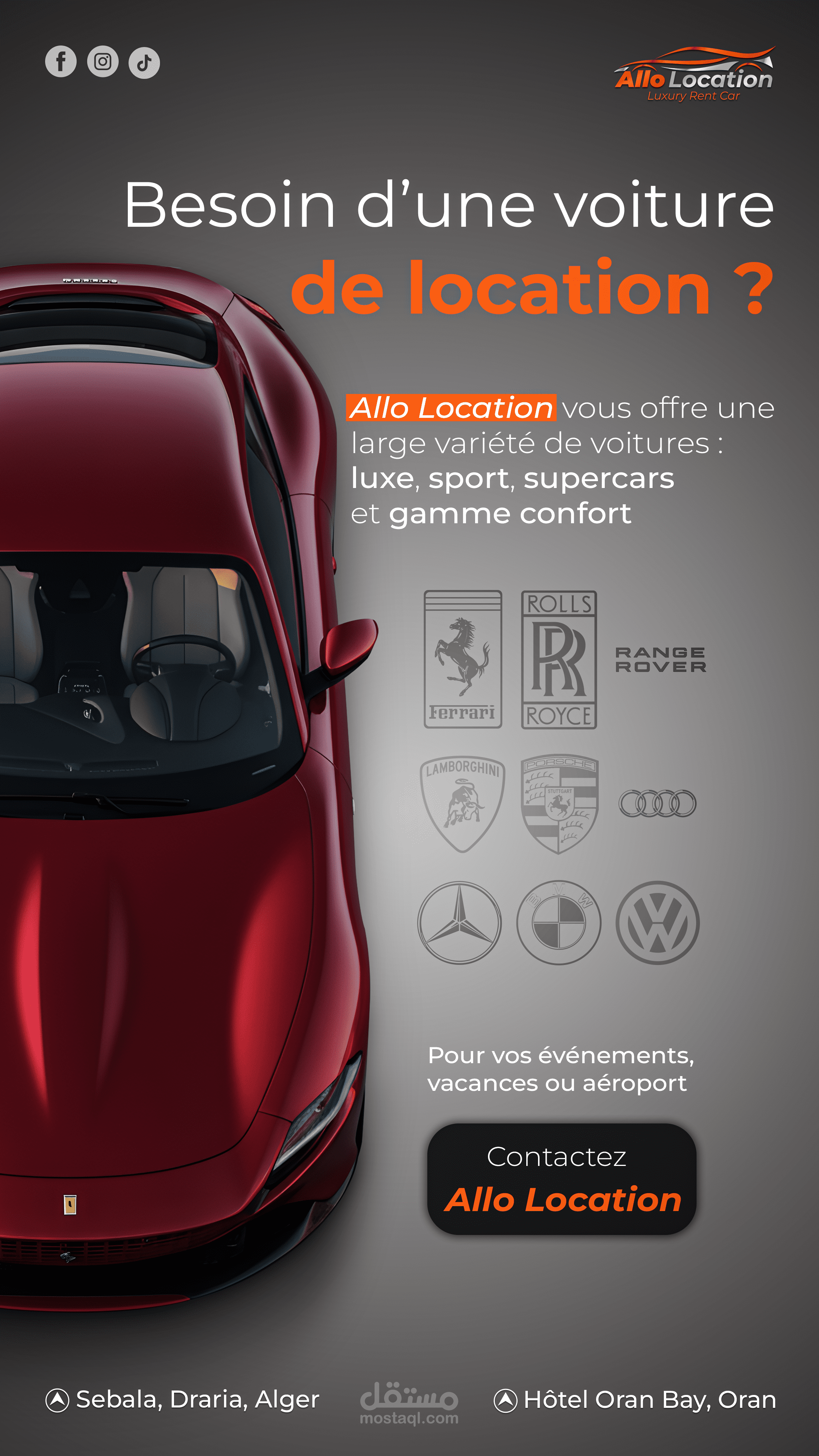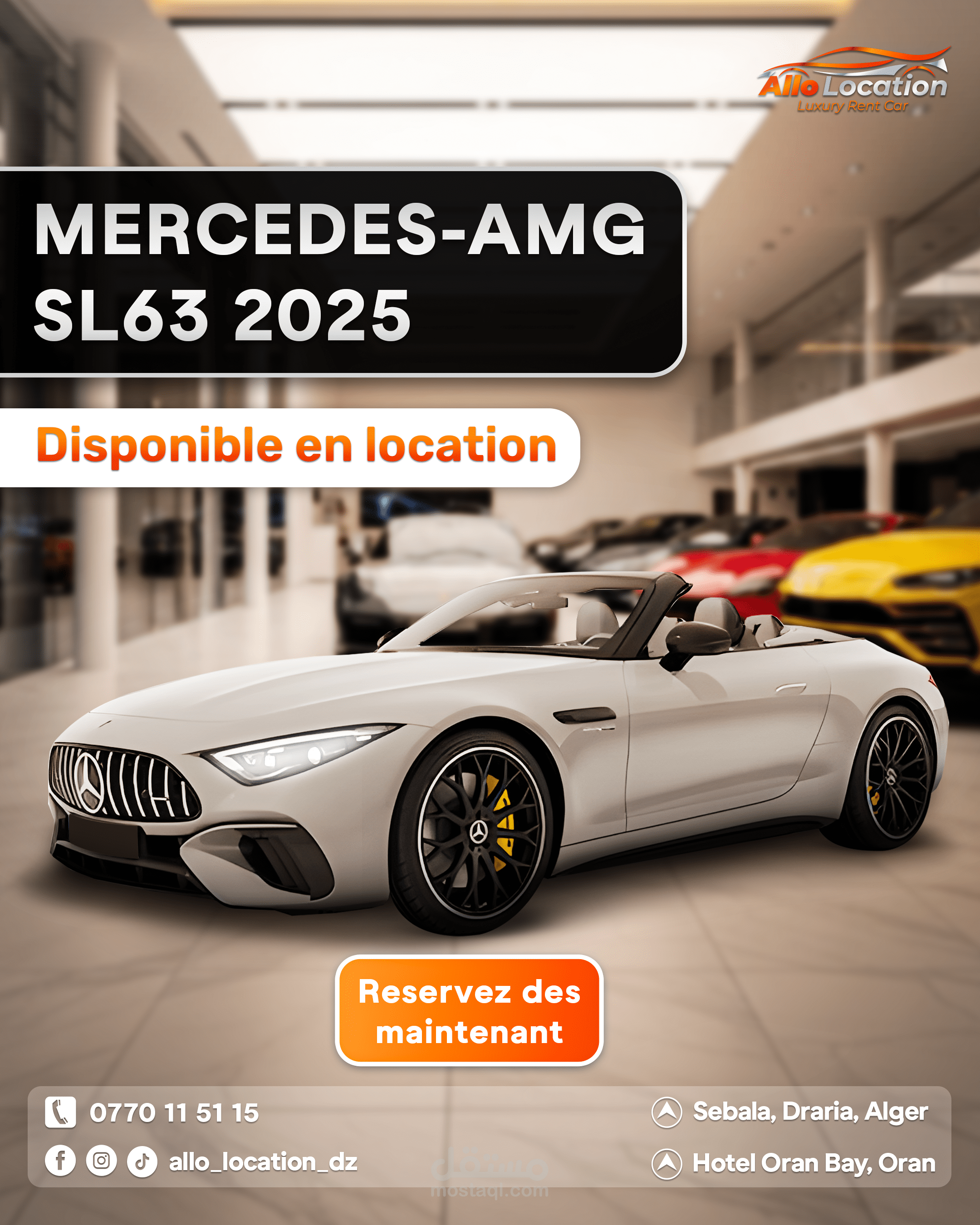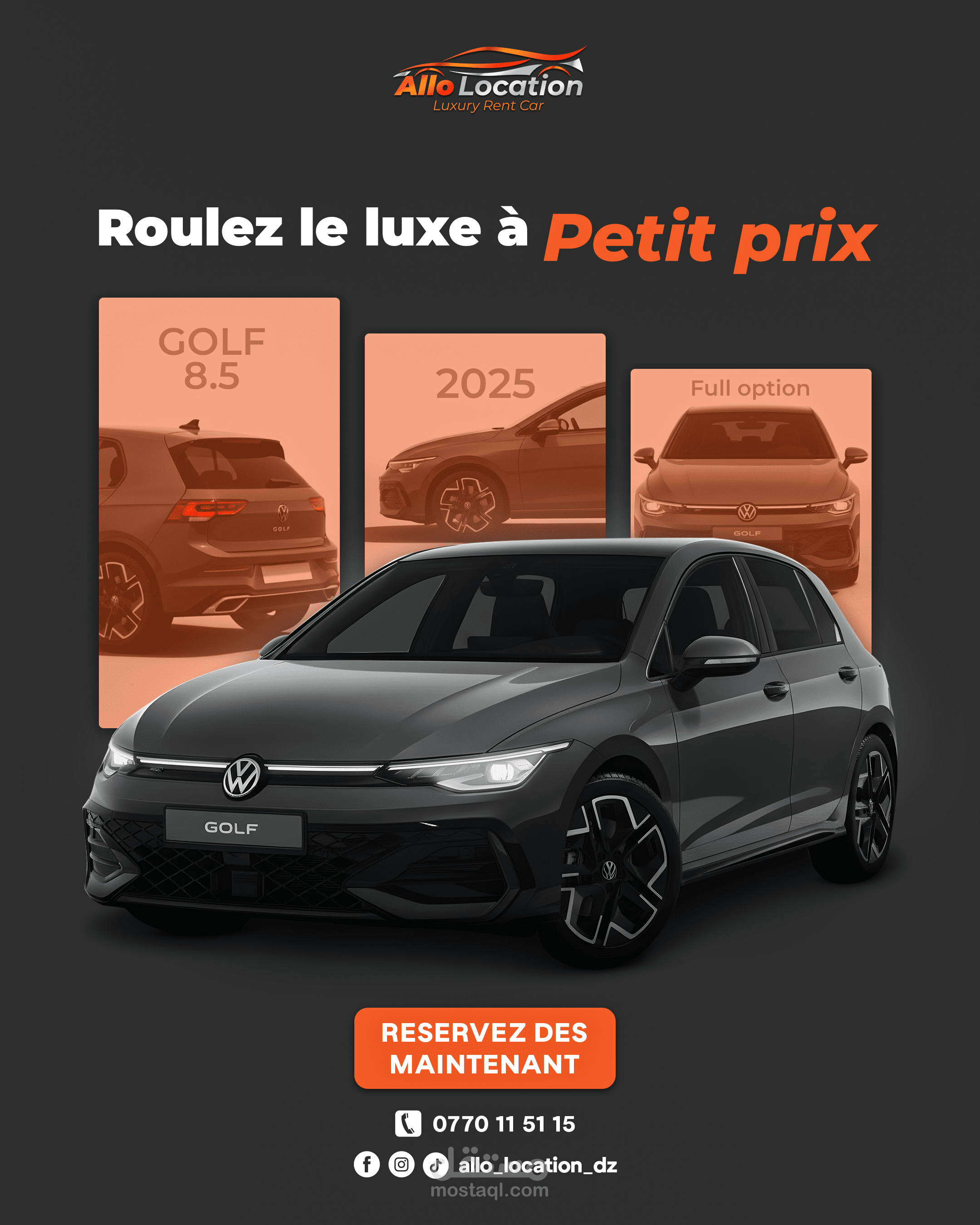 نماذج من تصاميم الإعلانات والسوشيال ميديا لعلامة متخصصة في تأجير السيارات الفاخرة، تم تنفيذها بأسلوب بصري احترافي يبرز تفاصيل السيارات ويعزز حضور العلامة على المنصات الرقمية