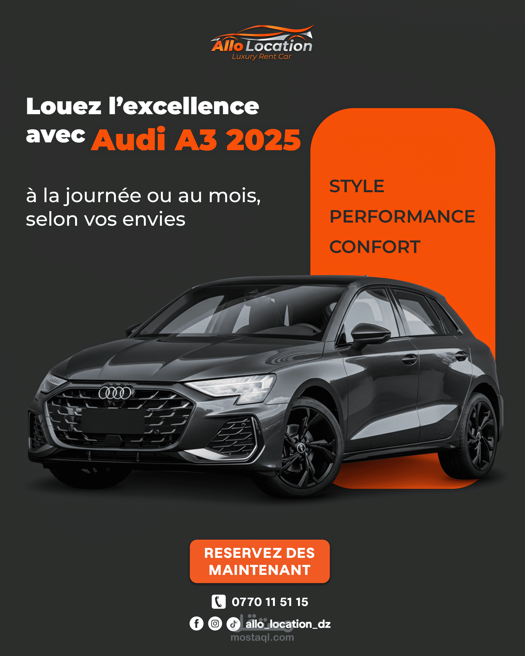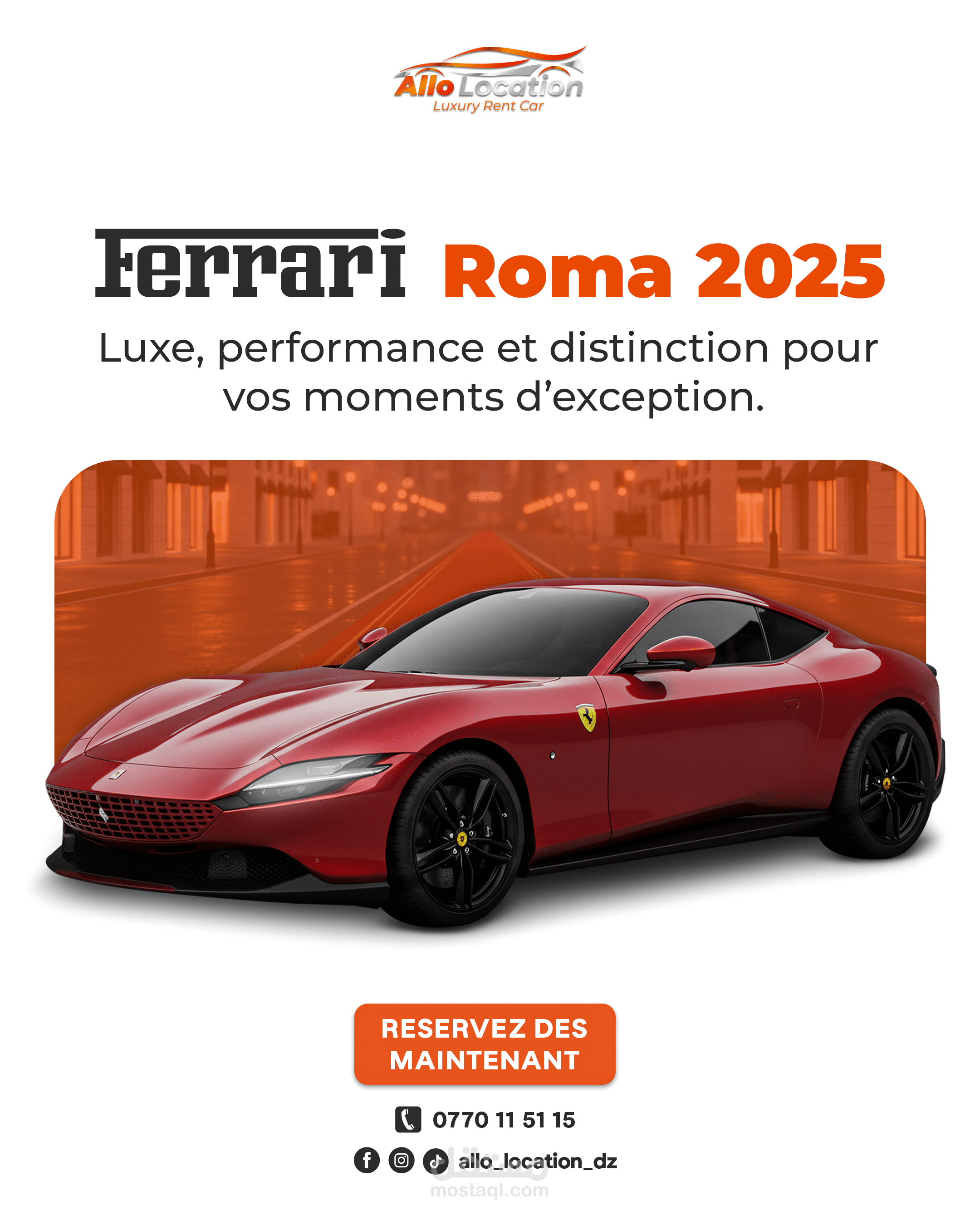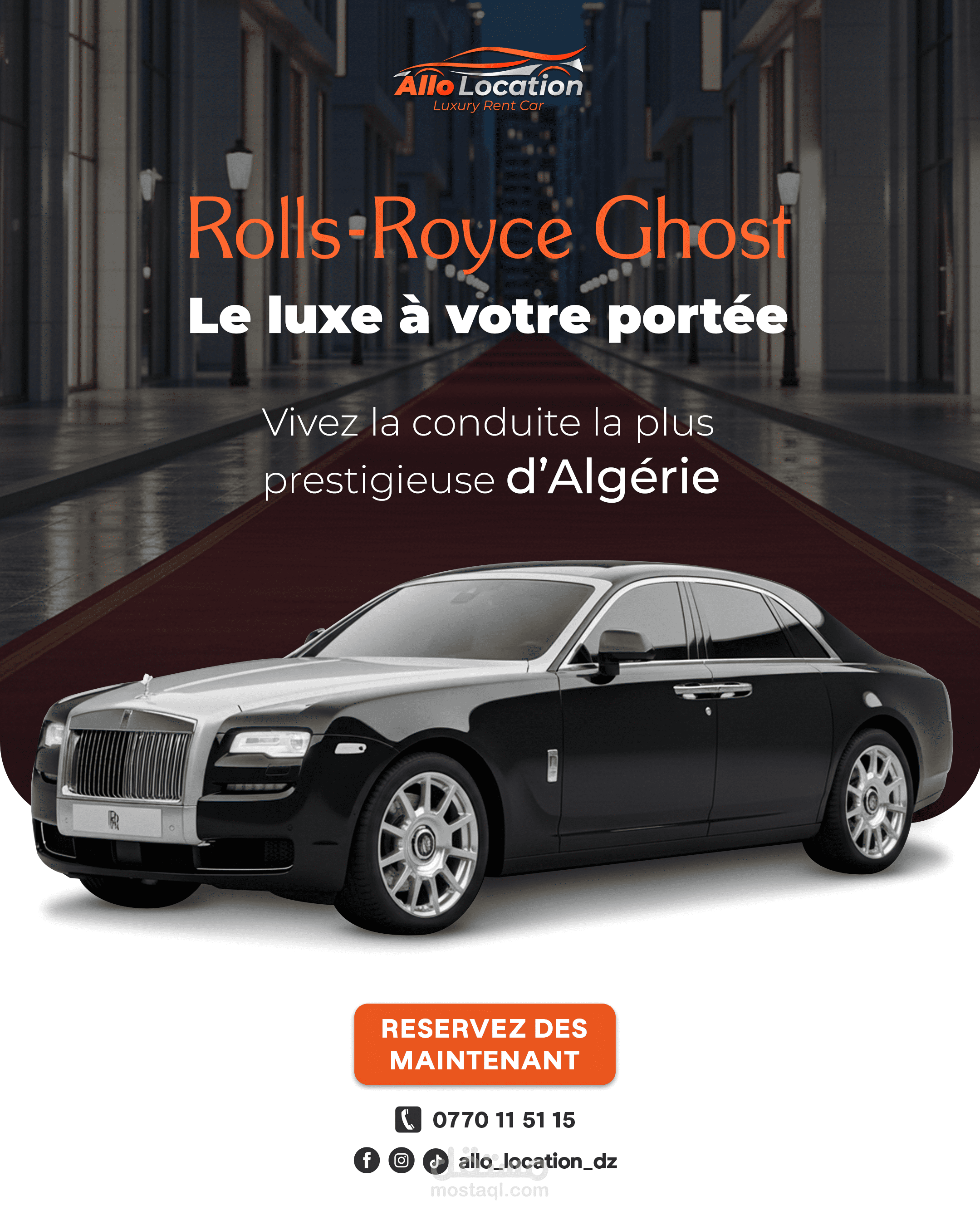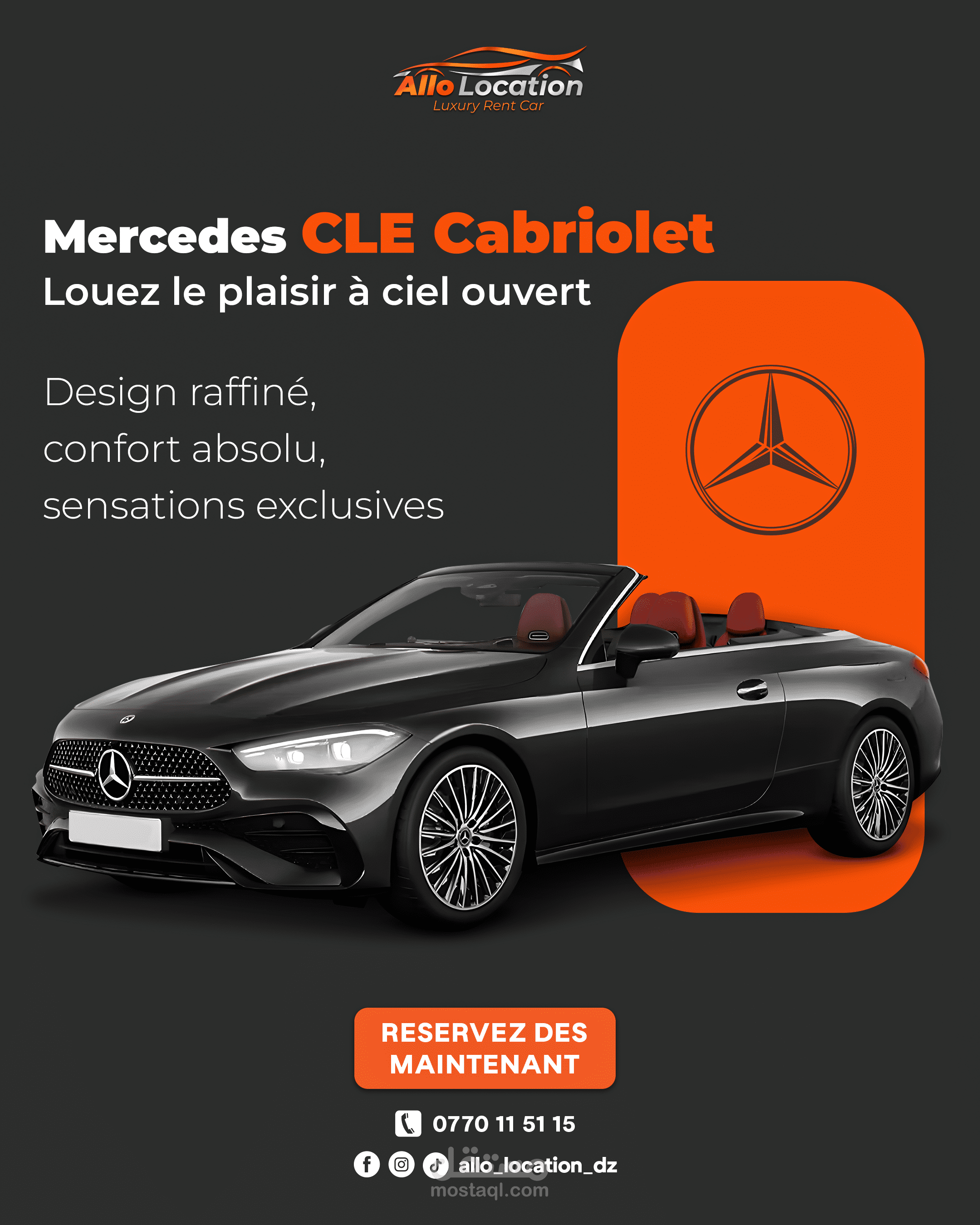 نماذج من تصاميم الإعلانات والسوشيال ميديا لعلامة متخصصة في تأجير السيارات الفاخرة، تم تنفيذها بأسلوب بصري احترافي يبرز تفاصيل السيارات ويعزز حضور العلامة على المنصات الرقمية