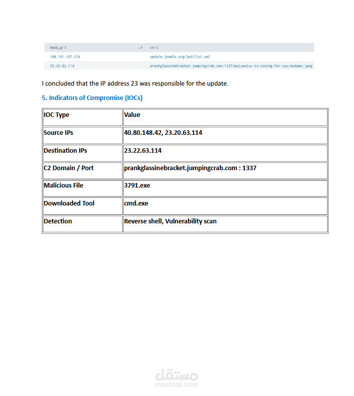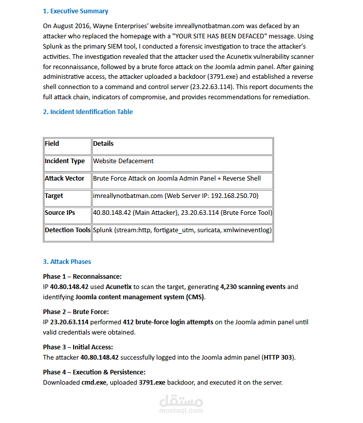 التحقيق كشف إن الـ **attacker** بدأ بمرحلة **reconnaissance** باستخدام أداة **Acunetix vulnerability scanner**، وبعد كده عمل **brute-force attack** على صفحة **Joomla administrator login**. بعد ما قدر يحصل على **valid credentials**، قدر يدخل على السيرفر كـ **administrator**، ورفع ملف **malicious executable** اسمه **3791.exe**، وبعدها أنشأ **reverse shell connection** مع **command-and-control (C2) server**.