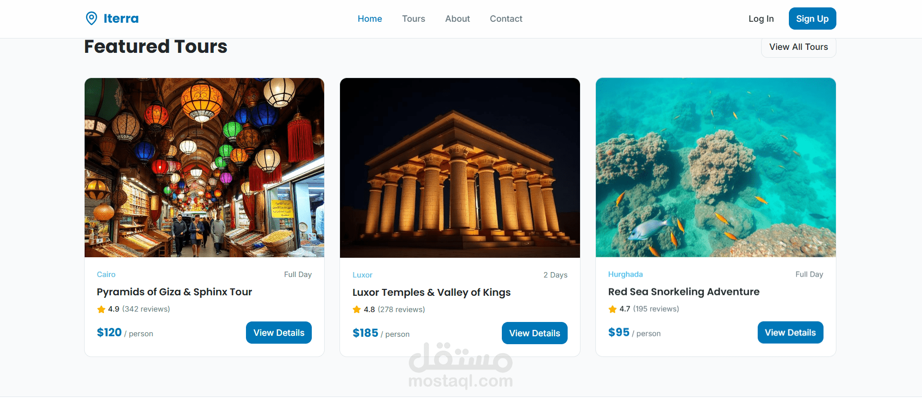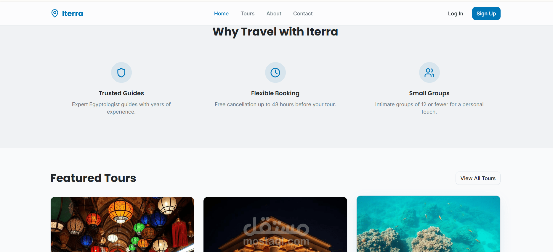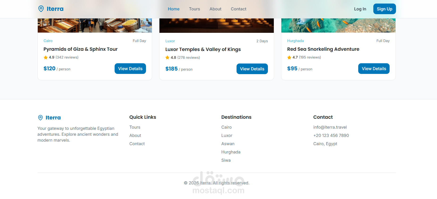 Iterra is a full-stack travel and tour booking web application designed to help users explore and discover destinations across Egypt. The platform provides an intuitive interface where users can search for tours, view travel destinations, and book curated travel experiences easily.