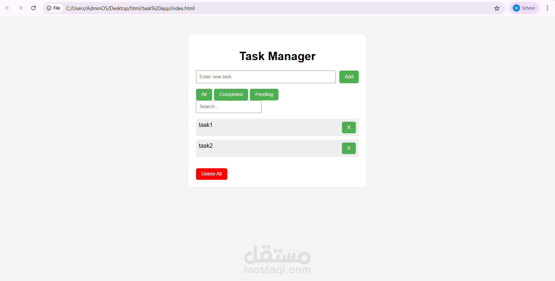 A simple and interactive web-based Task Manager built with HTML, CSS, and JavaScript. Users can add, complete, and delete tasks easily through a clean, responsive interface. This project demonstrates front-end development, DOM manipulation, and dynamic user interaction.