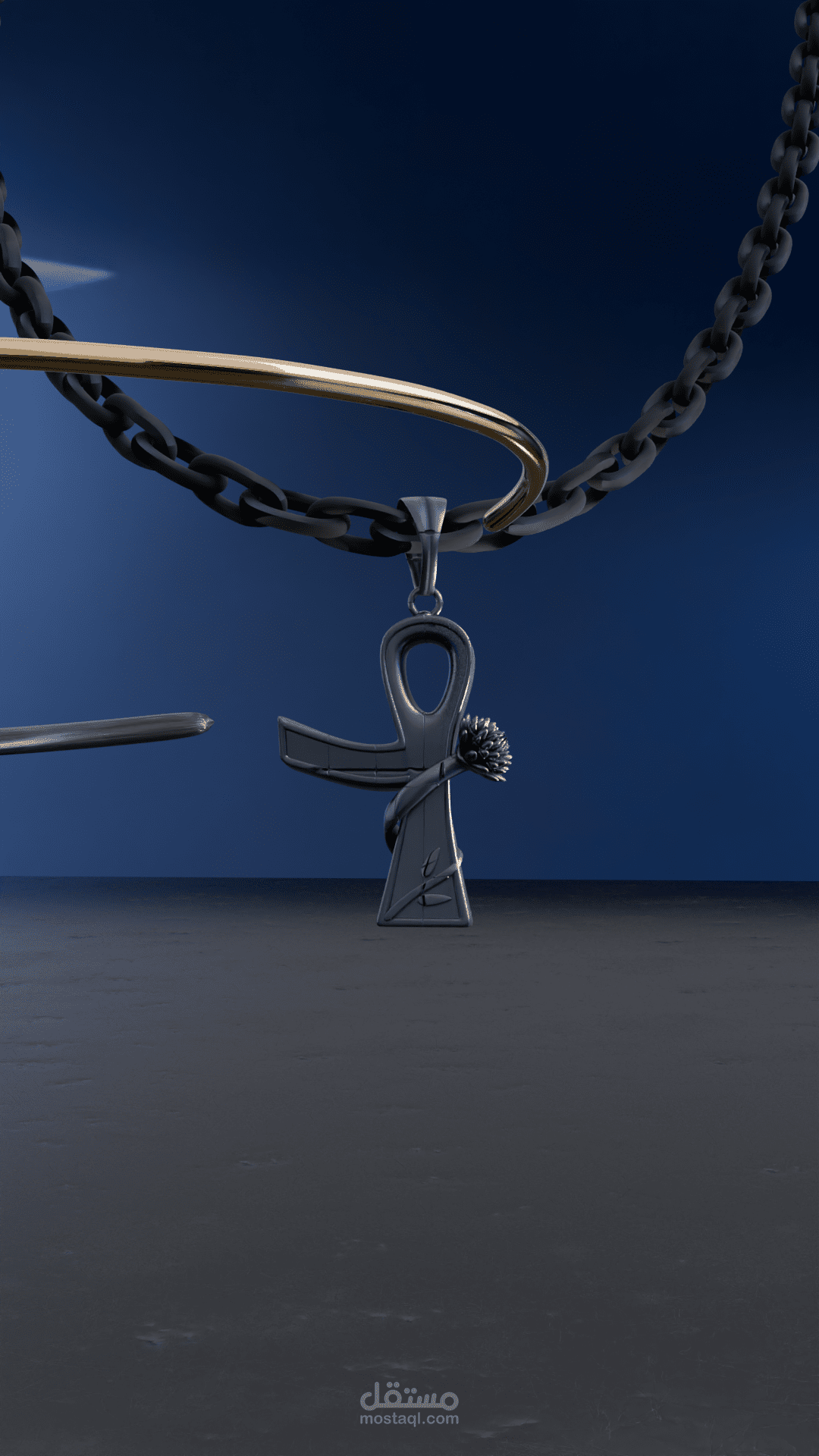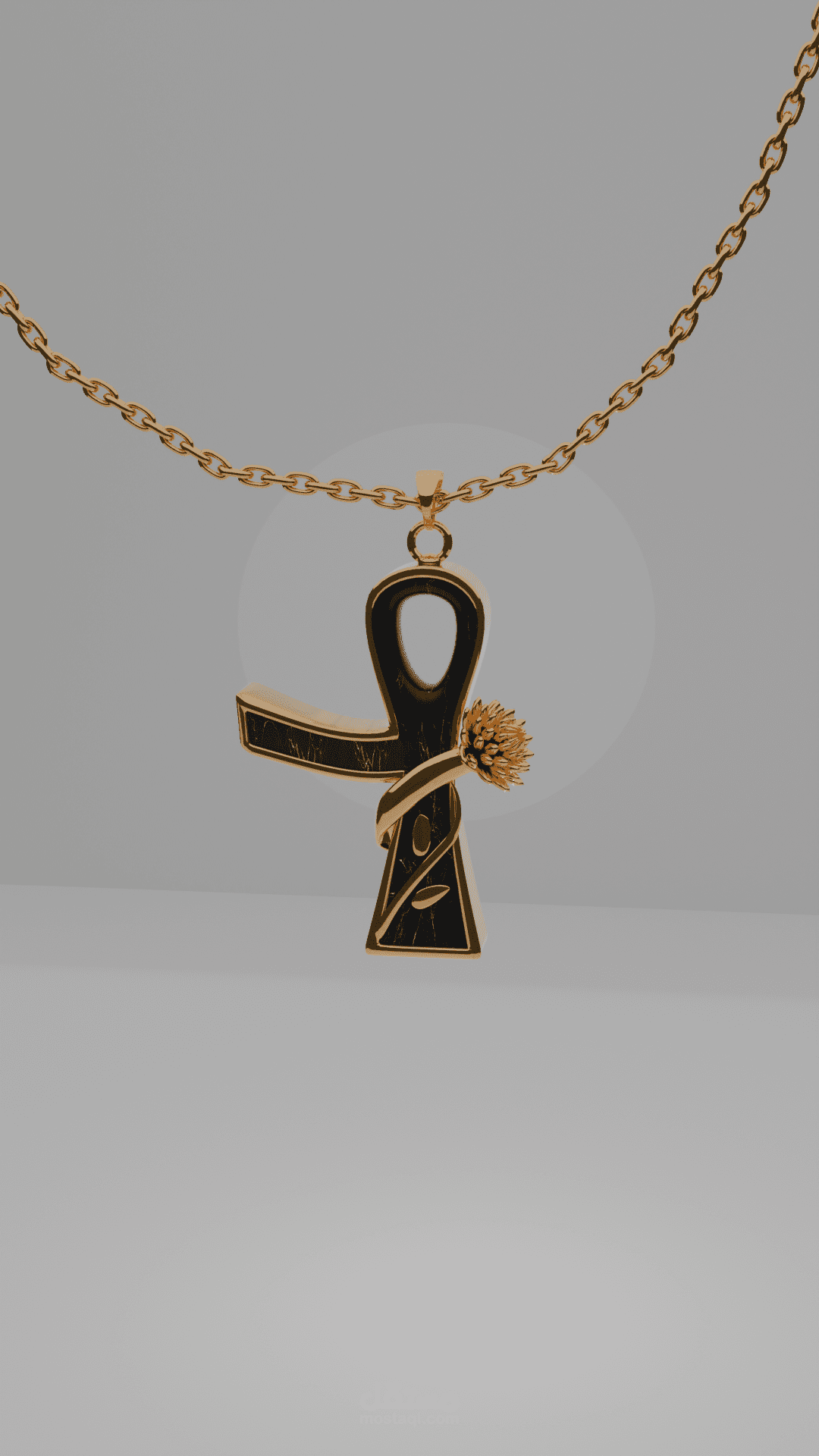 a 3D jewelry product visualization featuring a gold chain necklace with a pendant inspired by the ancient Egyptian Ankh, the well-known symbol of life associated with Egyptian culture and mythology.